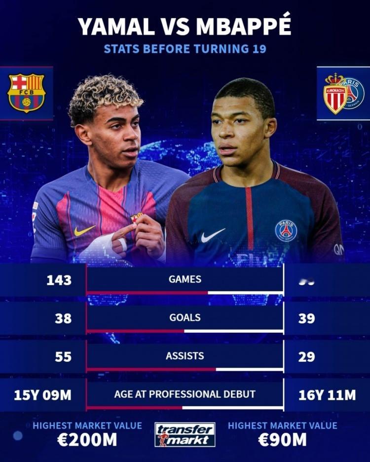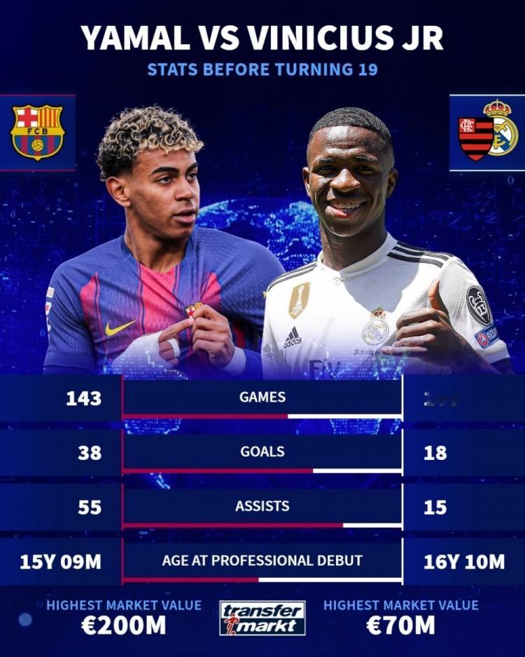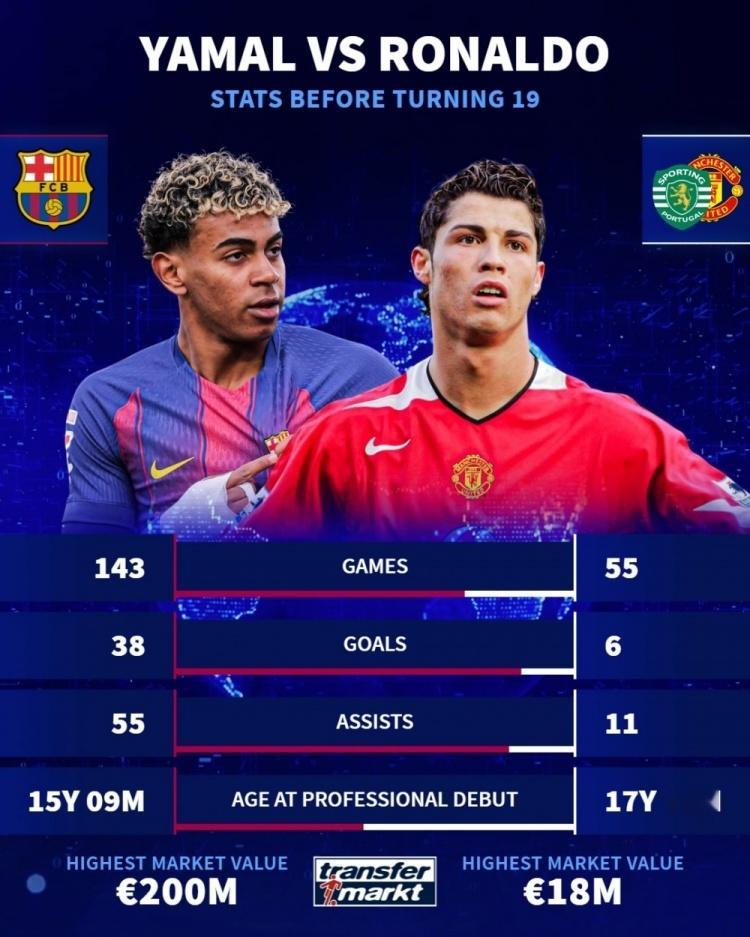 球员19岁之前数据:亚马尔38球55助,梅西11球9助,C罗6球11助,内马尔5
