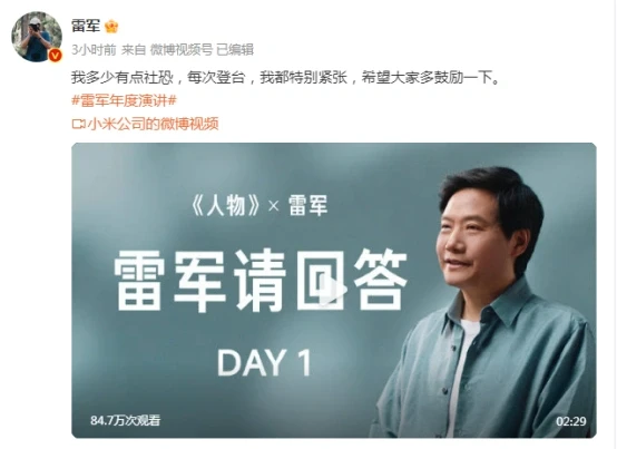 而除了发布预告外,雷军还上传了一段演讲预热片段“雷军请回答”。在片段中,他坦言自己有点“社恐”,虽然已经开过50场发布会,但每次登台前,依然会紧张,希望大家多鼓励一下他。