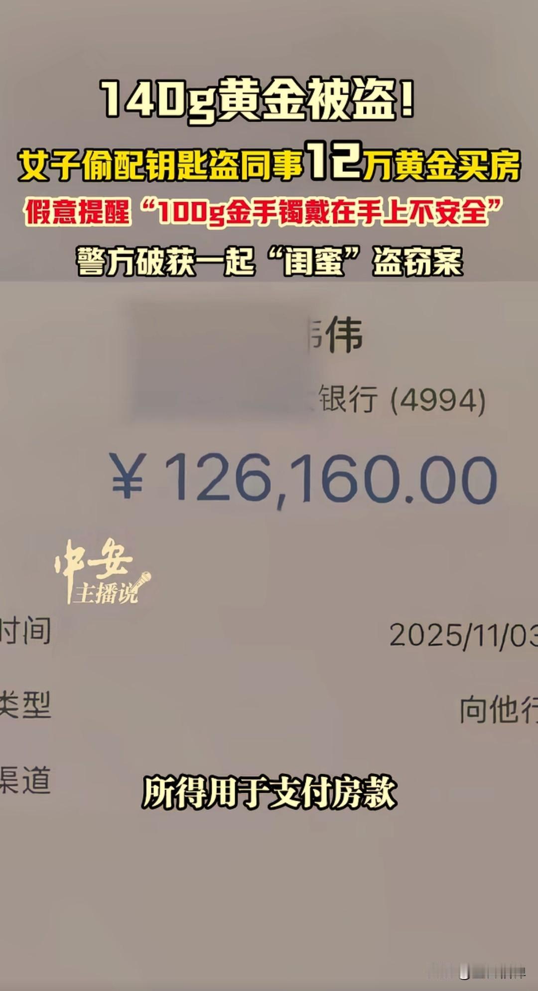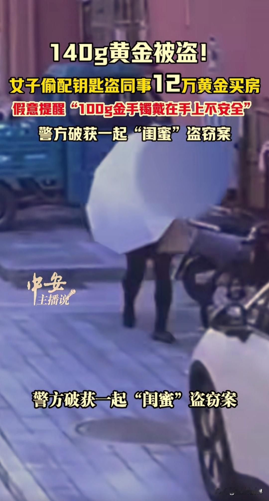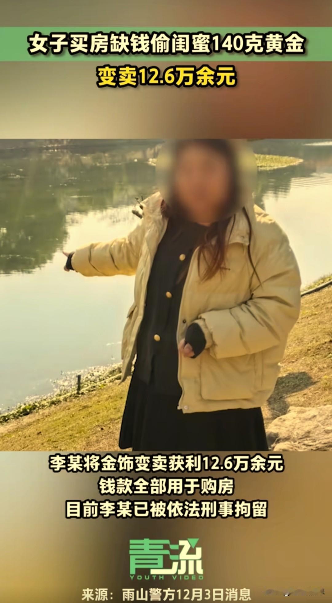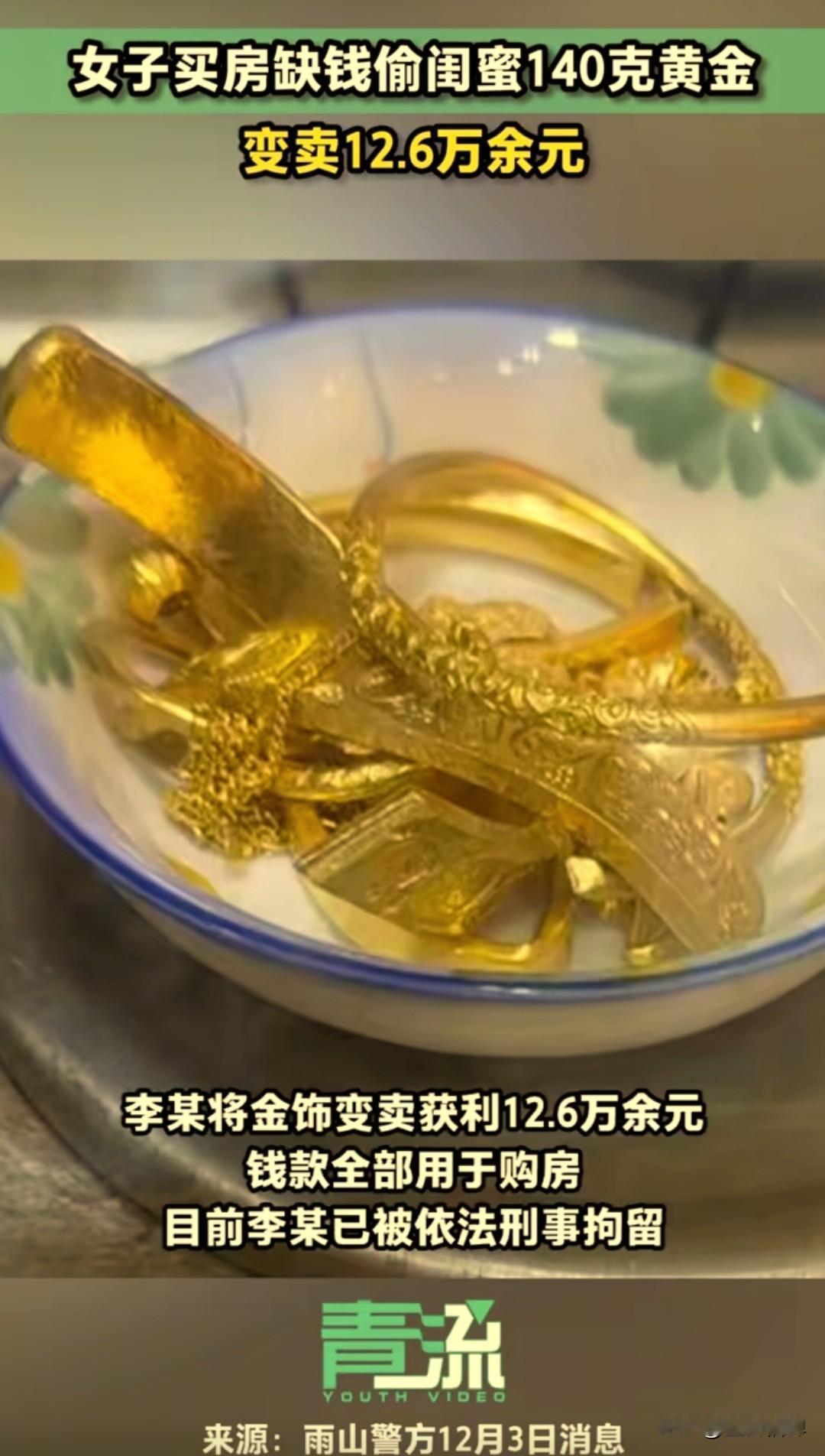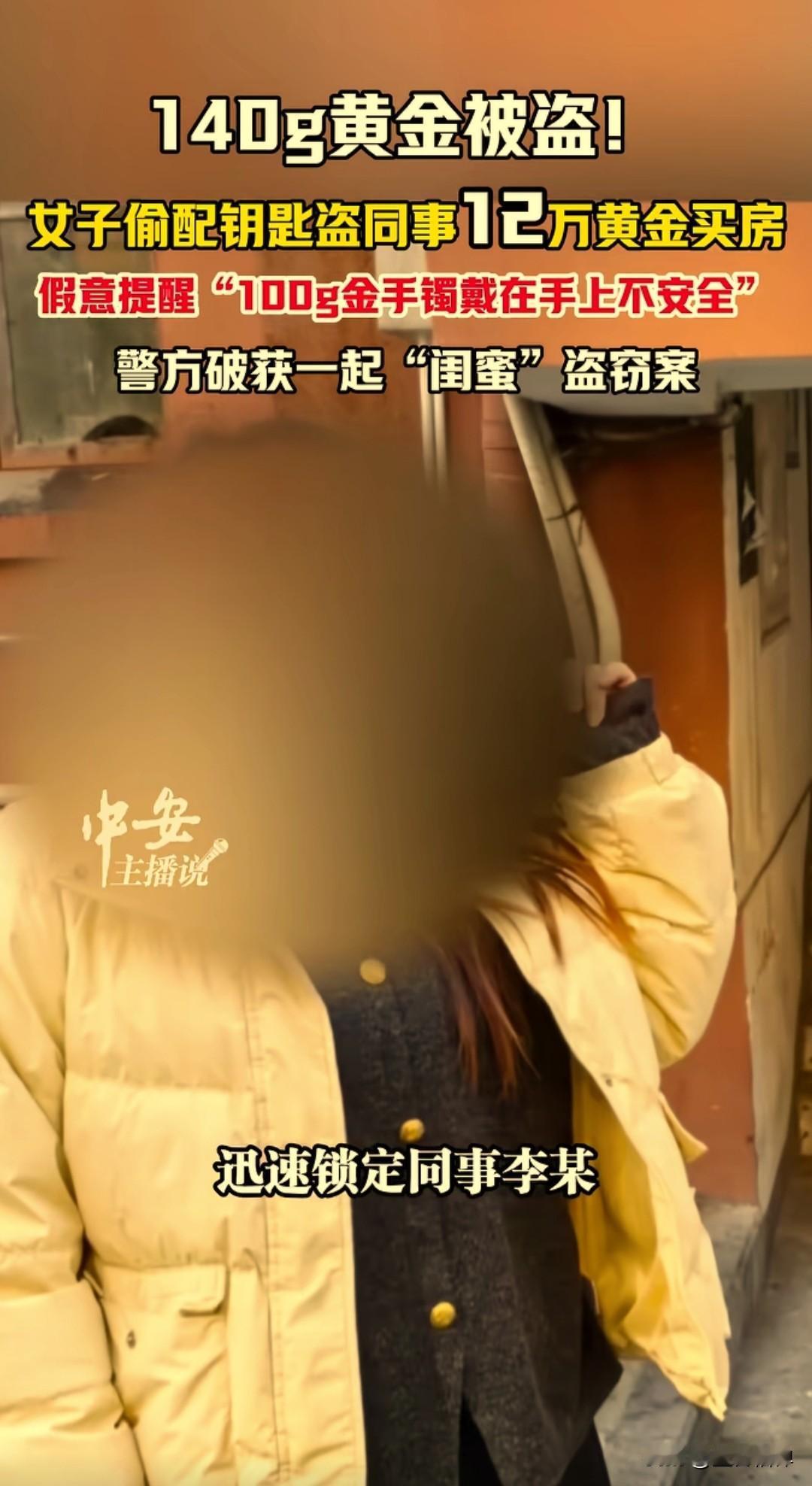 安徽马鞍山一女子李某,偷配钥匙盗走同事价值12万元的黄金,之前假意还提醒说这么贵重的手镯戴在手上不安全,同事听到后把金手镯放在了家里,李某偷偷配了一把钥匙去同事家里偷走卖了拿去买房。 35岁的李某想要买房子,因资金短缺一直苦恼,偶然间看到同事郭女士戴一个大约140克的金手镯,在确认是真的之后起了贪念。 李某给郭女士说戴着这么大的金手镯不安全,万一丢了或者被偷了这样损失太大了,郭女士想想也是,就把金手镯放在了家里,也不佩戴了。 这李某通过闲聊又知道了郭女士金手镯放在家里的位置,10月份去郭女士家里做客的时候偷偷拿走其家里钥匙,配了一把之后又悄悄的把钥匙放了回去。 11月3日的时候,两人一起出去给公司发传单,李某知道了发传单的行程,就换了衣服戴上口罩,还打了一把伞为了躲避监控拍到,潜入郭女士家里,很熟练的找到首饰盒就把金手镯偷走。 李某拿走了金手镯,有现金一万块钱没拿,得手之后把钥匙和首饰盒丢掉,晚上还给郭女士打视频电话,确认郭女士没有察觉,就把这个金手镯变卖了12.6万元,支付了房款和买了家电。 11月25日,郭女士发现首饰被盗,打电话报了警,警方勘查后发现没有外力侵入痕迹,判断为熟人作案,迅速锁定并捉获李某,在监控视频风证据面前,李某最终认罪。 警方通过此事提醒公众,务必妥善保管好贵重财物,不轻易向他人透露存放位置,哪怕是朋友或者闺蜜,警惕熟人作案风险。