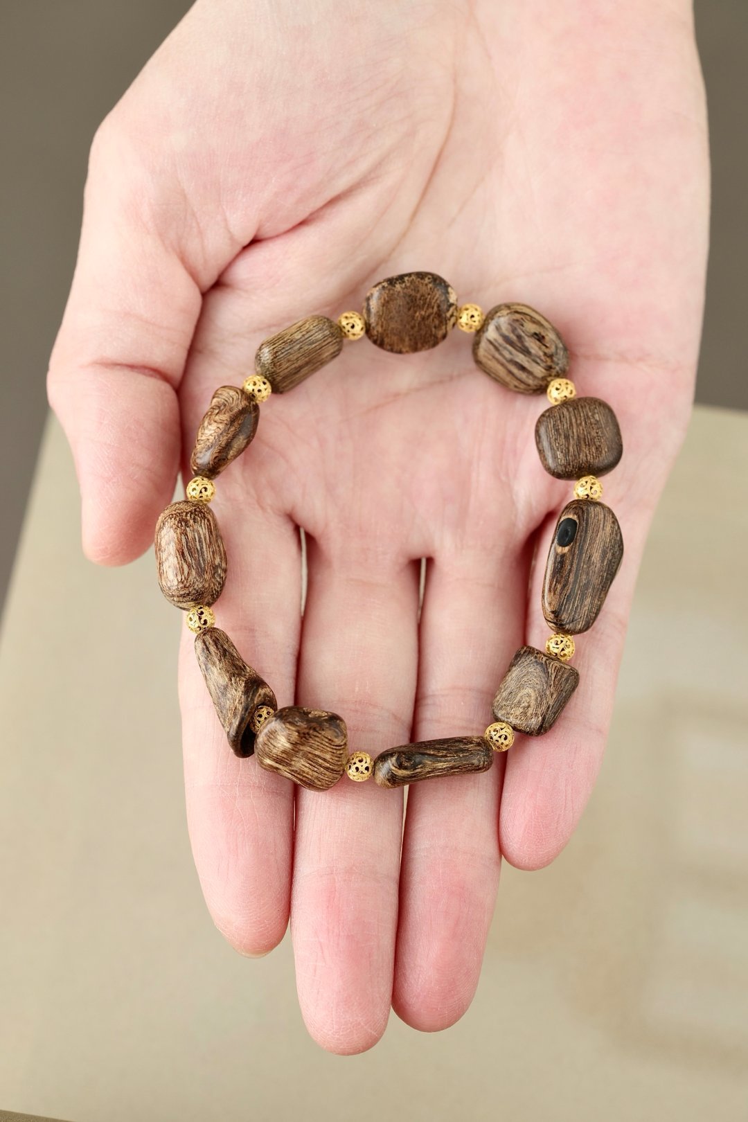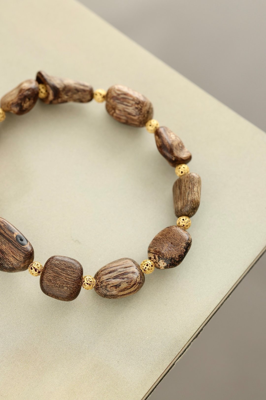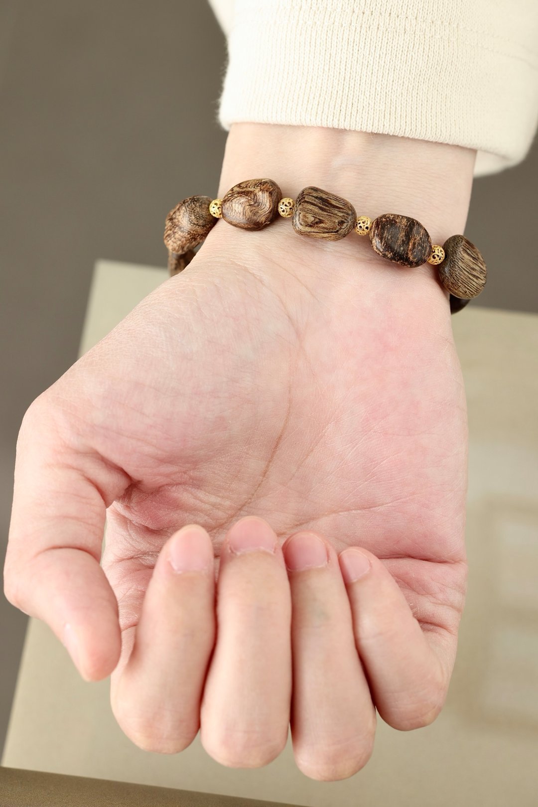 惠安沉香 | 随形手串沉水,香气高雅,甜韵饱满,随形打磨,质朴大气,银鎏金卷草纹