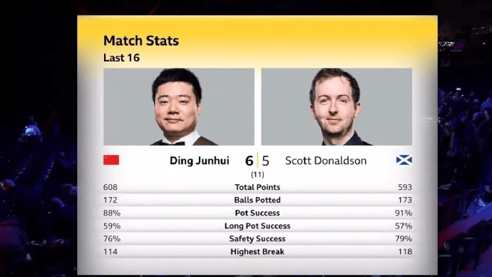 全场比赛,丁俊晖打出两杆破百(114、109)和三杆50+(50、76、60),唐纳森打出一杆破百(118)和四杆50+(50、69、81、72)