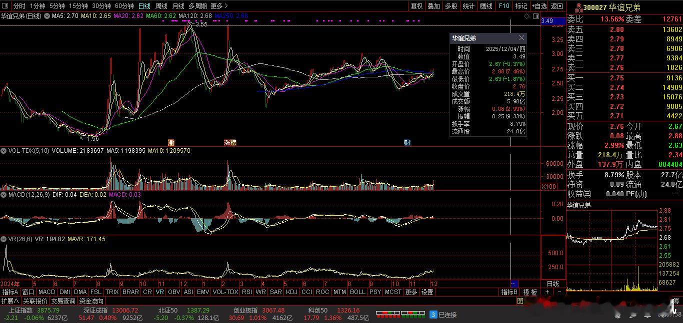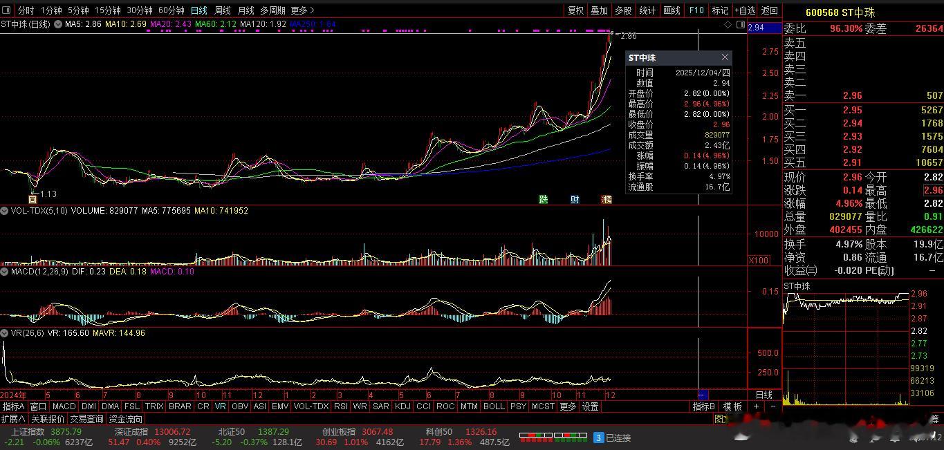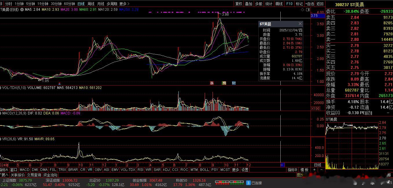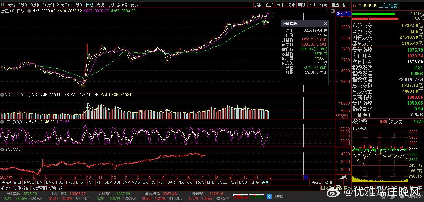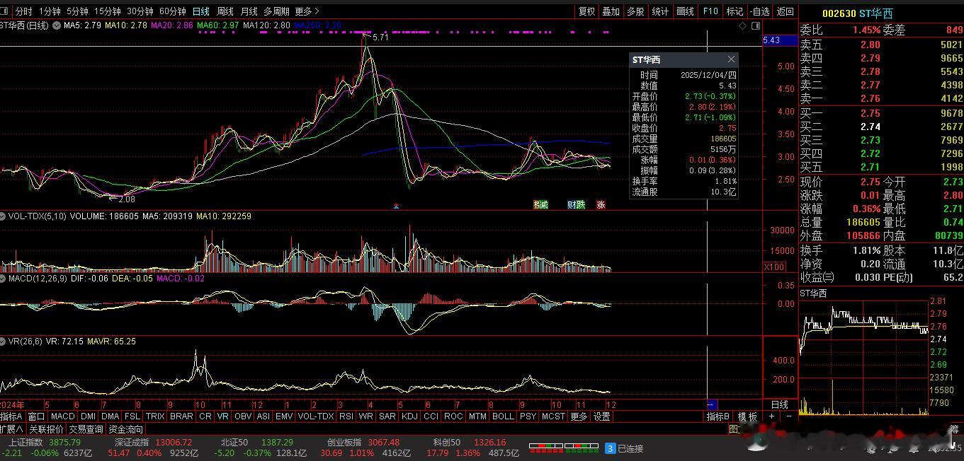【财富晚茶】三元股市收评:沪指跌0.06%:航天强势上扬焦炭探底导语:作者系《网易号》优质财经领域创作者。曾经原创作者和知名网易号旅游领域创作者。大跨度行业等的写作,颇受网友喜爱。作品发表于2025.12.04.15:18优雅端庄晚风。一、瞧ST华西:八年箱底002630 ST华西 盘中01涨1、八年底部:今年突破今日视野:前期三顶:杀跌反弹。2025-12-04 截止15:00:收盘股价:2.75元,上涨0.36%。成交总量:186605万。成交金额:5156万元。总换手率:1.81%。总市值达:28.33亿元,流通市值:28.33亿元。2、新源锅炉:国际知名主营业务:高效节能洁净燃煤环保锅炉-新能源综合利用锅炉等研产和销售。公司品牌:国内一流国际知名新能源利用系统方案供应商和服务商。3、营收净利:三季递减公司经营:2025-09-30 三季度报:公司营收:14.4612亿 同比增-29.50%,实现3732.7546万 同比增-50.93%。二、多空搏杀:沪绿深红1、追踪盘面:蛛丝马迹沪深场景:早盘:高开二跌,三涨一跌。午盘:三跌一涨,三跌二涨。尾盘:深指:一跌一涨,中位红盘。沪指:一跌一涨,中位绿盘。看点之一:沪指弱势:盘中高开:窄幅震荡,瞬间走低。看点之二:二朵金花:深创两指:逆势走强。看点之三:沪深北市:合计成交:15617亿元。场内个股:3878股飘绿。2、板块涨跌:风口依然涨跌观察:板块见证:板块拉升:航天、半导体等。板块走低:焦炭、旅游餐饮、食品饮料、酿酒、农业、地产、零售等。概念活跃:人形机器人、商业航天、卫星导航等。3、技术看盘:涨跌位置观K线提示:精彩多空博弈。12月05日:沪指突破阻力:03888点看涨,前程似锦;跌破支撑位:03859点看跌,日暮途穷。深指突破阻力:13042点看涨,鹏程万里;跌破支撑位:12881点看跌,不堪造就。三、三元板块:风口潜水1、追踪盘面:视角视野三元脆弱,沪深弱势。12股上涨,涨幅5%以上:1股涨停板。109股下跌,跌幅5%以上:8股跌停板。涨幅0%:10股0停板。涨幅0.00%+上涨个股:10+12=22股票赚钱。沪深两市:合计成交15617亿元。总体归纳:三元股票:盘口弱势。2、追踪盘面:主力进退换位思考:沪深杀跌,尾盘吸筹。沪指距9:31-15:00:前第1第3小时放量盘跌,中第2小时略量盘升,后第4小时略量盘升。深指距9:31-15:00:前2小时放量盘升,中1小时略量盘跌,后1小时略量盘升。沪深两市:合计成交:15617亿元。四、透析个股:聚焦涨跌1、涨幅榜眼:处排查摸主旋律:涨幅榜之中:寻找启动600568 ST中珠 300237 ST美晨 300027 华谊兄弟涨幅榜-1:600568 ST中珠主营业务:药品-肿瘤治疗产品-住宅地产开发等研产和销售。公司品牌:大健康-肿瘤治疗头部企业。涨幅榜-2:300237 ST美晨主营业务:橡胶非轮胎-园林绿化D 研产和销售。公司品牌:国内外非轮胎橡胶制品重要综供商和头部企业。涨幅榜-3:300027 华谊兄弟主营业务:电影电视剧制作衍生业务-艺人经纪服务等研产和销售。公司品牌:中国血统的世界级娱乐集团。2、跌幅榜眼:处排查摸主旋律:跌幅榜之中:寻找金子300344 *ST立方 300391 *ST长药 600340 华夏幸福跌幅榜-1:300344 *ST立方主营业务:智能软硬件-数字智能-数字智能平台定制等研造和销售。公司品牌:新型数字基础建设的数字科技云服务商。跌幅榜-2:300391 *ST长药主营业务:医药制造-通用设备制造-新能源的研产和销售。公司品牌:亚洲最有影响力道地药材全产业链头部供应商。跌幅榜-3:600340 华夏幸福主营业务:产业新城-商业地产的研产和销售。公司品牌:中国产业新城服务商。3、潜力榜眼:处排查摸主旋律:潜力榜之中:寻找估值002496 *ST辉丰 300301 *ST长方 000669 ST金鸿潜力榜-1:002496 *ST辉丰主营业务:生物农资-农资电商-石化仓储供应链-项目投资。公司品牌:中国领先亚临界小分子高温裂解工艺高科技专利产品和头部企业。潜力榜-2:300301 *ST长方主营业务:LED照明光源器件。公司品牌:LED照明光源器件头部企业。潜力榜-3:000669 ST金鸿主营业务:天然气。公司品牌:国内最具实力的综合性清洁能源服务商。五、本创作者:优质网易投资投机迷茫之中:给予尽可能有帮助:资本市场风险自负。(优雅端庄晚风《网易号》优质财经领域创作者和原创作者; 违者必究)