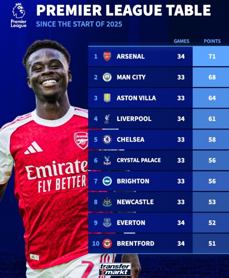 直播吧12月5日讯《转会市场》统计了2025年英超总积分情况,阿森纳多赛1场力压曼城居首。