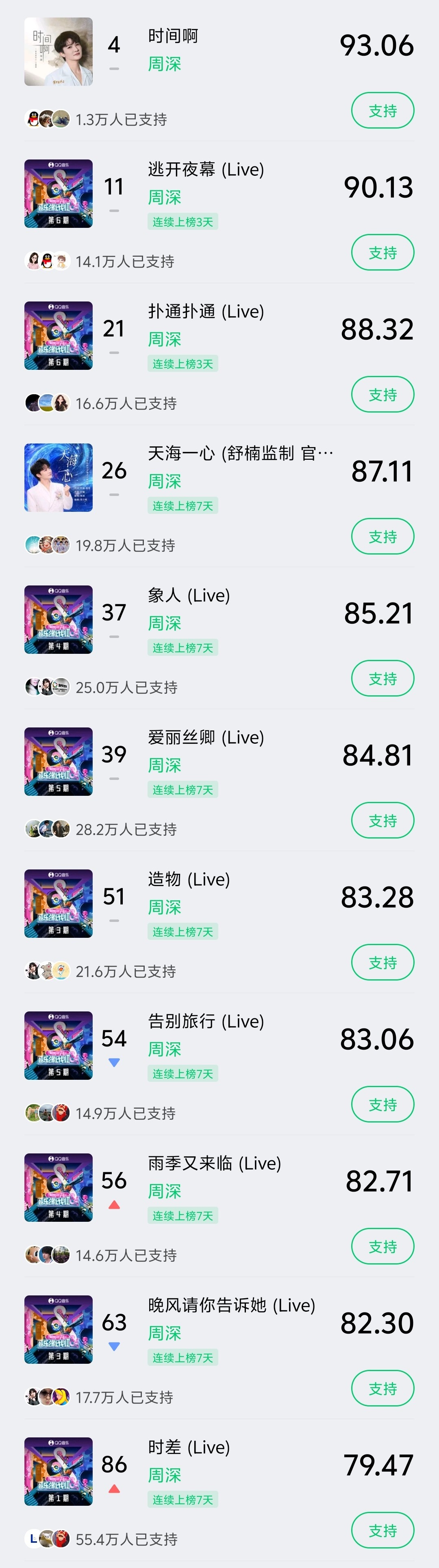 周深 📣 12.4 巅峰潮流 📣米米们晚上好每歌做6个动作路径:Q音-乐馆-排行-潮流巅峰✅《时间啊》✅《逃开夜幕(live)》✅《扑通扑通(live)》✅《天海一心》✅《象人(live)》✅《爱丽丝卿(live)》✅《造物(live)》✅《告别旅行(live)》✅《雨季又来临(live)》✅《晚风请你告诉她(live)》✅《时差(live)》完成『支持』让更多人听到深深