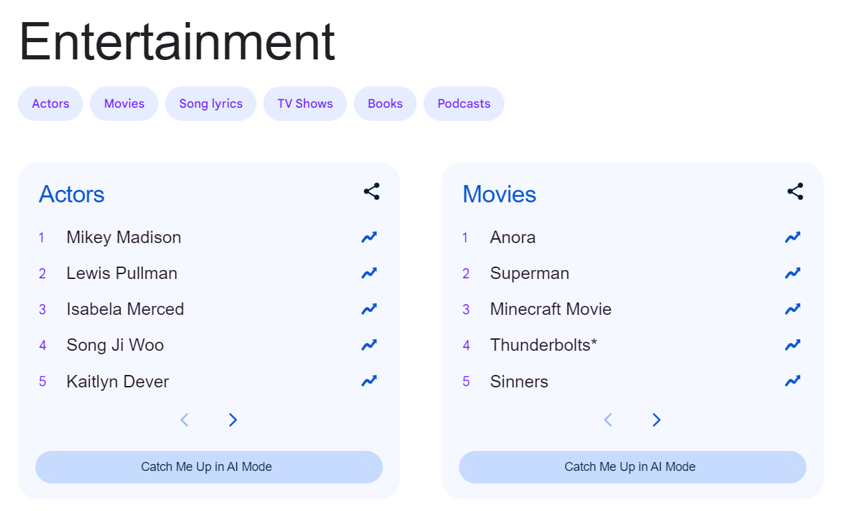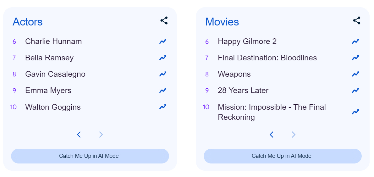 2025年Google搜索次数最多的演员及电影榜单公布。演员榜单中,麦琪·麦迪森(凭借《阿诺拉》成为目前最年轻奥斯卡影后)名列榜首,前2~5名依次是:刘易斯·普尔曼(《雷霆特工队》)、伊莎贝拉·莫塞德(《最后生还者》《超人》《异形:夺命舰》)、宋智友(《鱿鱼游戏》)与凯特琳·德弗。电影榜单前十分别为:《阿诺拉》《超人》《我的世界大电影》《雷霆特工队》《罪人》《高尔夫球也疯狂2》《死神来了6:血脉诅咒》《凶器》《惊变28年》《碟中谍8:最终清算》