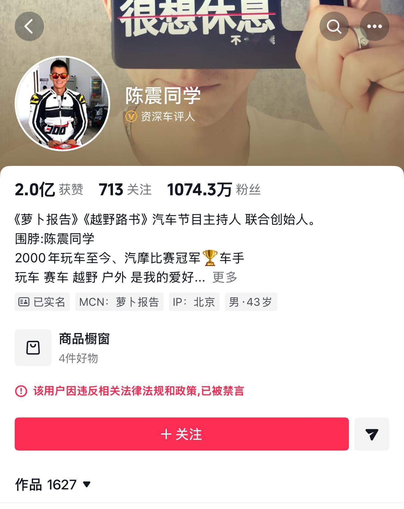 不止微博,陈震的抖音、小红书、B站全部禁言了。