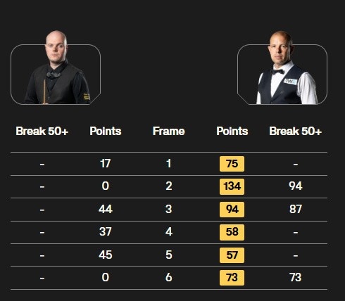 巴里·霍金斯打出三杆50+(94、87、73),连胜六局,最终6-0横扫埃利奥特·斯莱瑟,晋级8强。