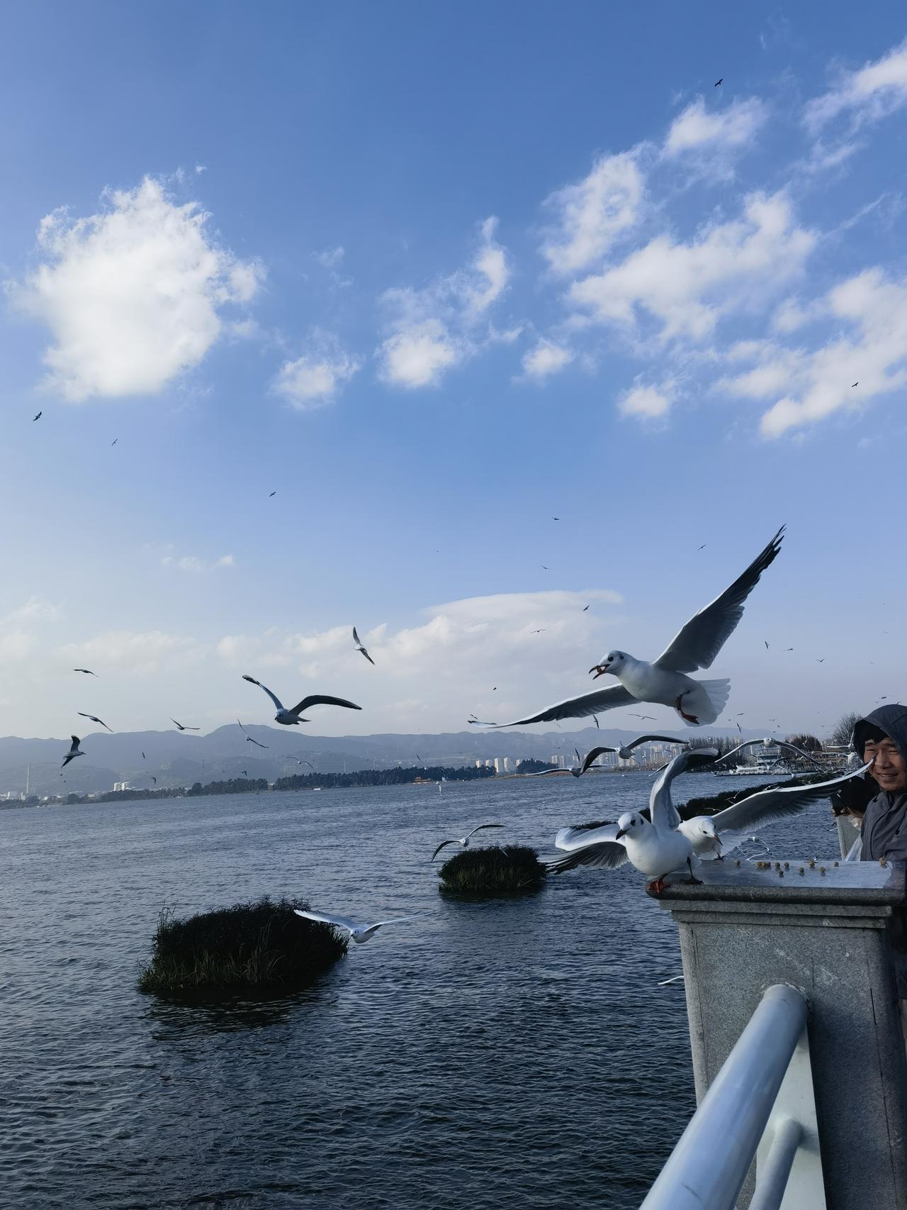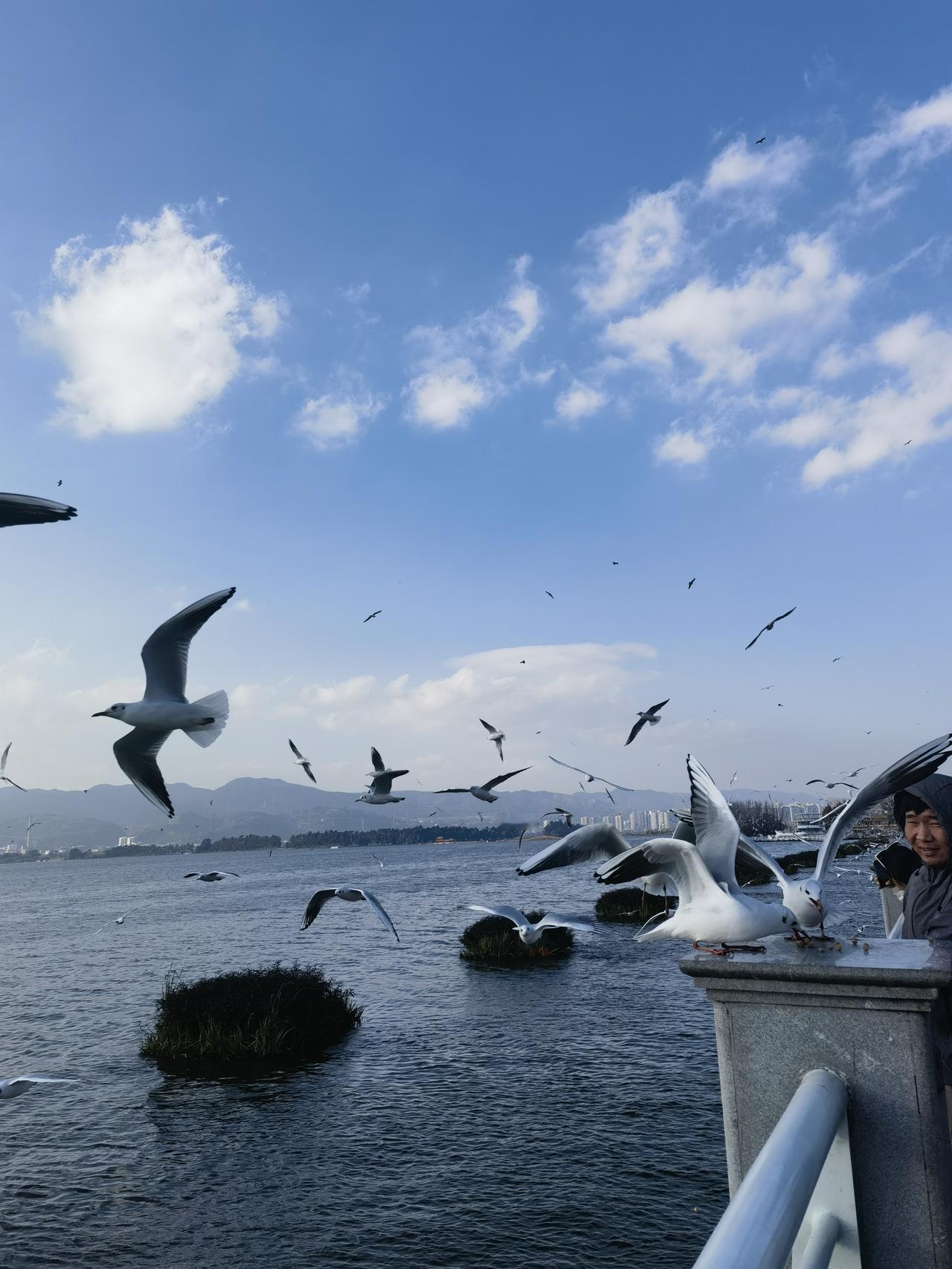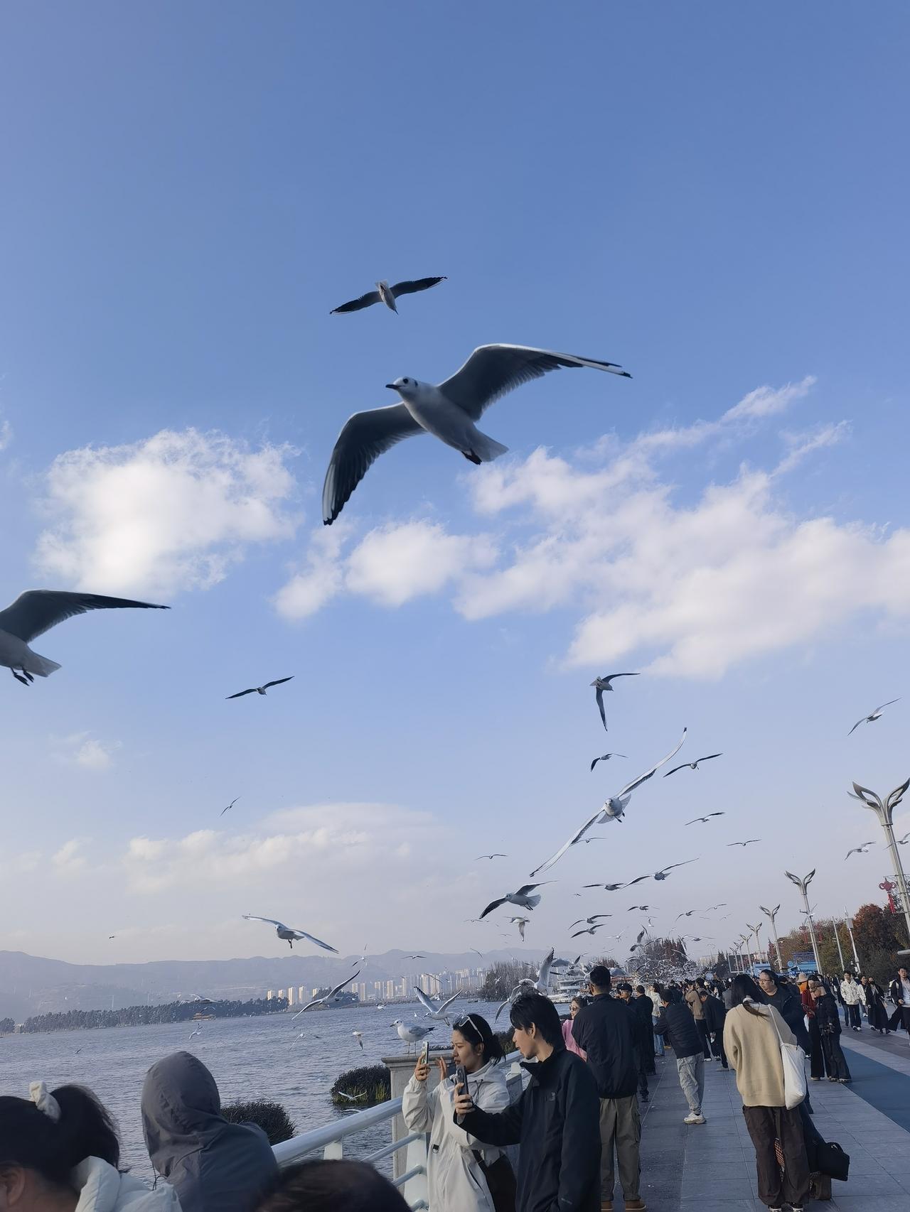 云南旅游系列篇(一) 标题:滇池 2025年12月3号,我和家人早早起床,开启了云南十天九晚游之旅。 上午10点,我们从宝安机场出发,仅两个半小时就抵达了昆明上水机场。 旅行社的接客小巴士将我们送到了下榻的酒店。签完旅游合同后,我们顺利办理了入住手续。客房条件相当不错。 下午是旅客自由活动时间。我们按照旅行社的指引,自行叫了滴滴,大约半小时就到了滇池。 滇池的海鸥,绝对是不可错过的景致。想象一下,成群的海鸥在波光粼粼的滇池上轻盈飞舞,那画面美不胜收。 在景区,我们买了些面包投喂海鸥。这里的海鸥格外可爱,它们会直接从你手中叼走食物,趣味十足。和海鸥互动拍照,每一张照片都宛如绝美大片。 到滇池看海鸥,免费且全天开放。阳光温暖,气温18度,十分适宜旅游。此时正值深秋,不过要留意,要是冬季前往,记得多添衣物,因为风比较大。 来云南,一定要到滇池与这些可爱的海鸥相遇,为旅行留下难忘的回忆。