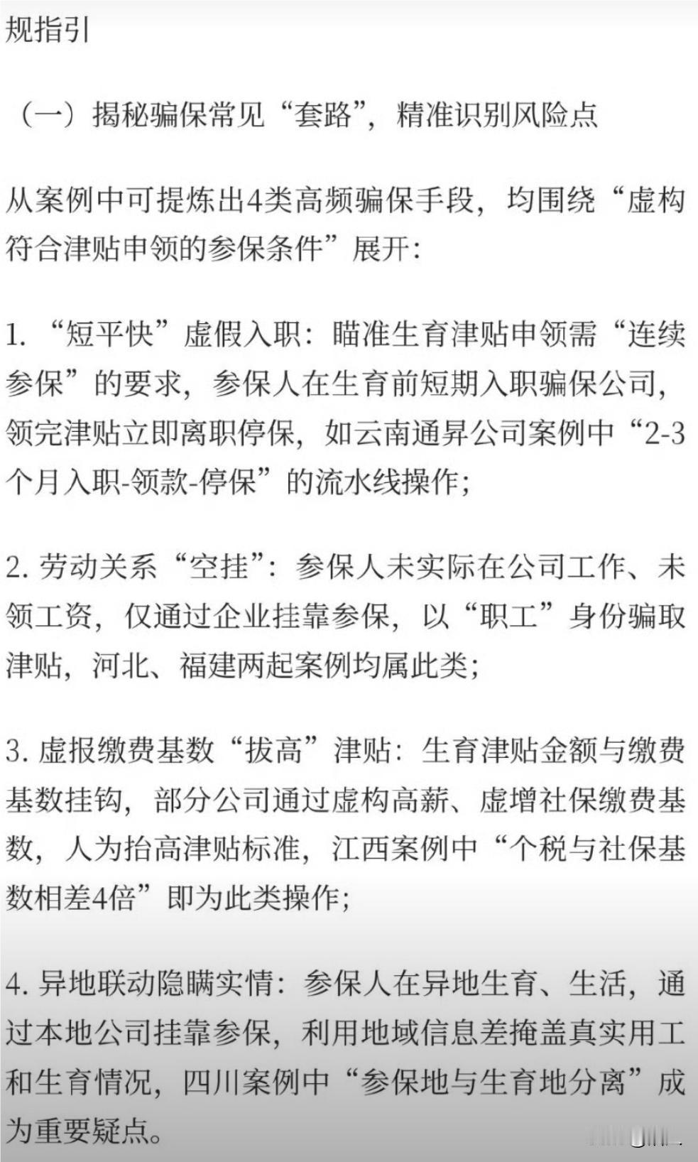 生育津贴成唐僧肉暴露规则漏洞! 生育补贴还没有完全发放完,“奸商”就嗅到了“商机”!! 云南某公司参保登记共30人,却有24人集中申领生育津贴,总额达227.1万元。这24人都是生育前2 - 3个月才转入该公司参保,参保时月平均缴费基数高达1.7万元,远超当地同类岗位实际工资水平,等申领完津贴后就立刻办理停保,明显是通过虚假入职、虚报缴费基数的方式骗取生育津贴。