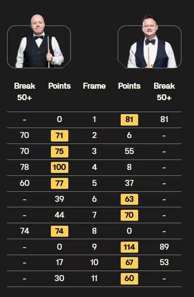 全场比赛,墨菲打出三杆50+(81、89、53),希金斯打出五杆50+(70、70、78、60、74)