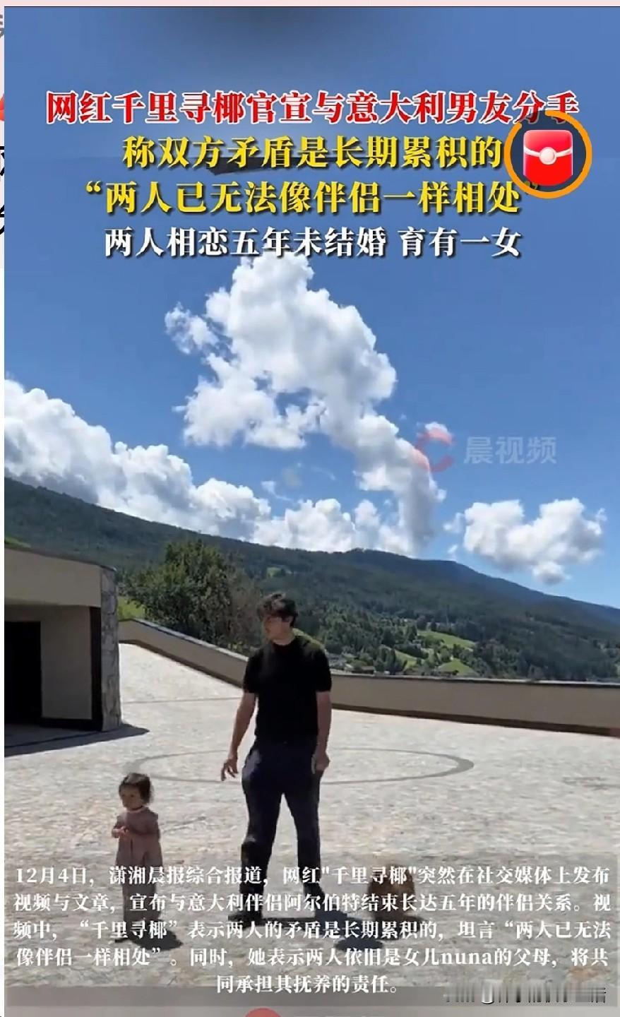 12月4日,百万粉丝网红“千里寻椰”官宣和意大利伴侣阿尔伯特结束五年伴侣关系,这消息一出让不少网友意外。此前他俩常分享跨国情侣日常,从文化碰撞到照顾女儿的温馨画面,收获大量点赞祝福,还被视作跨国恋范本。 其实早在今年8月,阿尔伯特就不再出现在她的vlog里,当时就有人猜测感情生变,现在看来那时两人已分居,阿尔伯特回了意大利父母家。千里寻椰坦言矛盾是长期积累的,在生活理念、责任分担等方面分歧凸显,尝试修补也回不到从前。不过对于女儿Nina的抚养,两人会共同负责,也算给大家一个交代。