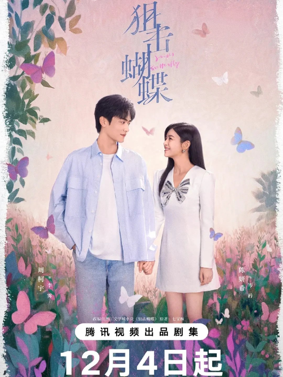 狙击蝴蝶《狙击蝴蝶》定档12.4/19岁年龄差的极致暧昧,我先嗑为敬🦋这部由大热小说改编的剧真的没让我失望!陈妍希x周柯宇,这对现实中相差19岁的CP,居然拍出了小说里那种细腻拉扯和宿命感。想嗑年下恋、救赎文学的姐妹,速速集合!📺 开播一手信息速递· 剧名:《狙击蝴蝶》· 主演:陈妍希(饰 岑矜)x 周柯宇(饰 李雾)· 集数:共30集· 关键日期:12月4日· 剧情基底:改编自七宝酥的同名高口碑姐弟恋小说。🎬 极致人设:清醒破碎姐姐 x 深情忠犬狼狗💘 高能看点:这“年下恋”张力太顶了!