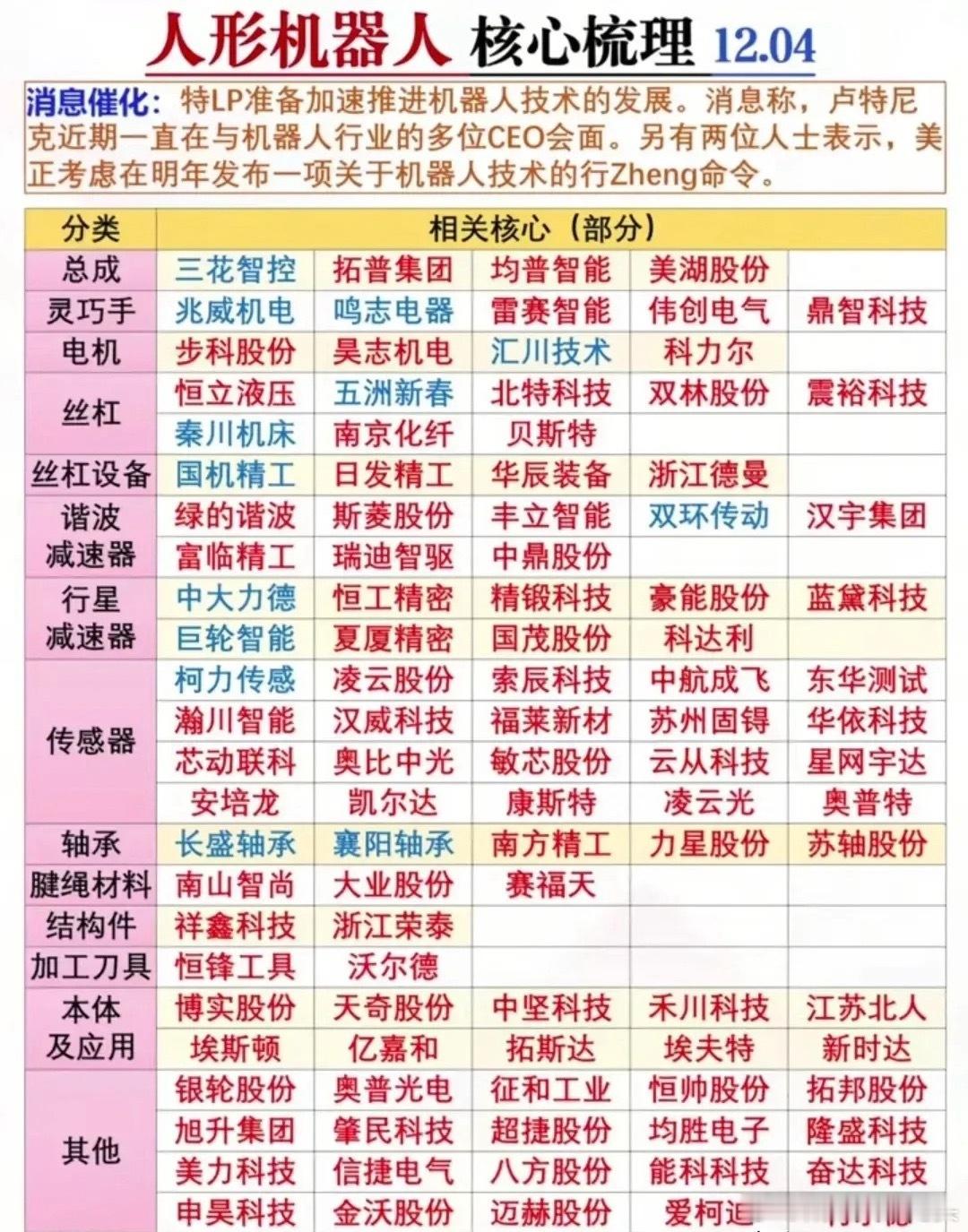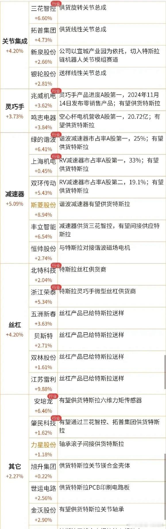 特斯拉机器人技术新突破,国内哪些公司与特斯拉机器人概念高度关联?12月3日特斯拉发布实验室跑步视频,擎天柱以约3.8米/秒速度稳定慢跑,该视频引爆全网,马斯克称V3版将于2026年初发布,逼真度还有大幅提升。特斯拉机器人的“供应链拼图”全面梳理从关节、灵巧手到减速器,A股公司分食千亿蛋糕。与特斯拉机器人高度关联的公司有拓普集团、三花智控、浙江荣泰、北特科技等等。北特科技:特斯拉丝杠的Tier2供应商三花智控:机器人关节模块核心供应商浙江荣泰:特斯拉机器人“灵巧手”的核心供应商之一,合作关系明确……理财有风险投资需谨慎资料取材网络仅供参考不能作为投资依据。