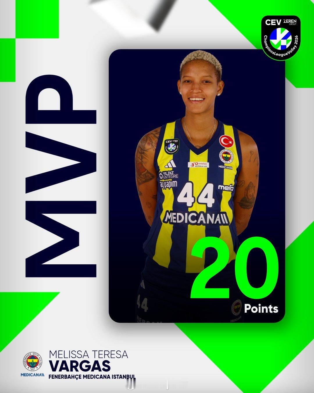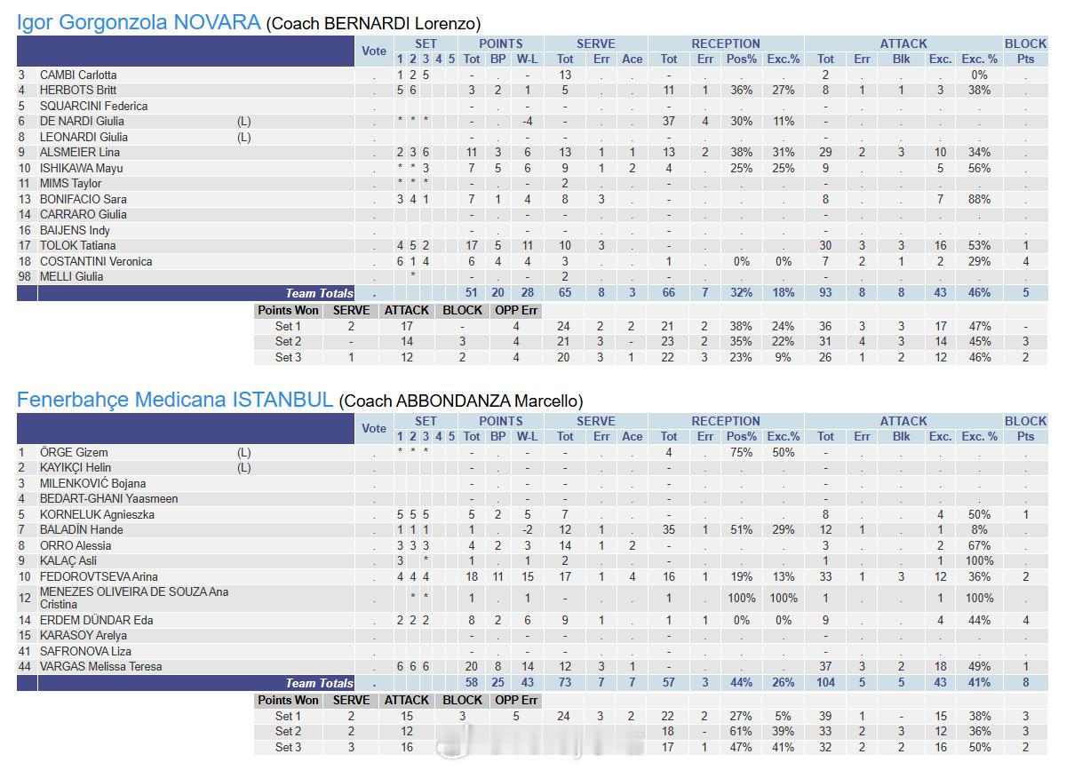2025-2026赛季女排欧冠小组赛第二轮,土耳其费内巴切3-0意大利诺瓦拉(25-23 25-21 25-19)瓦尔加斯20分,37扣18中,3失误2被拦,1拦1发小彩娃18分,33扣12中,1失误3被拦,2拦4发艾达8分,9扣4中,0失误被拦,4拦科尔内卢克5分,8扣4中,0失误被拦,1拦奥罗4分,3扣2中,0失误被拦,2发巴拉丁1分,12扣1中,1失误0被拦克里斯蒂娜1分,1扣1中卡拉奇1分,1扣1中托洛克17分,30扣16中,3失误3被拦,1拦阿尔斯迈尔11分,29扣10中,2失误3被拦,1发博尼法西奥7分,8扣7中,0失误被拦石川真佑7分,9扣5中,0失误被拦,2发科斯坦蒂尼6分,7扣2中,2失误1被拦,4拦赫博茨3分,8扣3中,1失误1被拦排坛动态女排欧冠