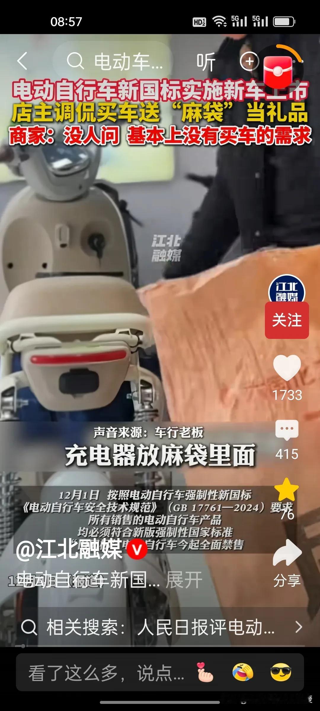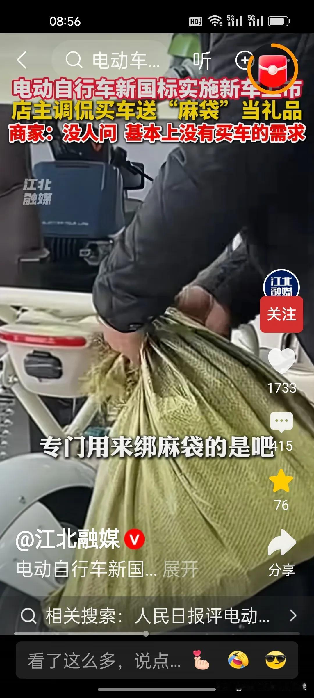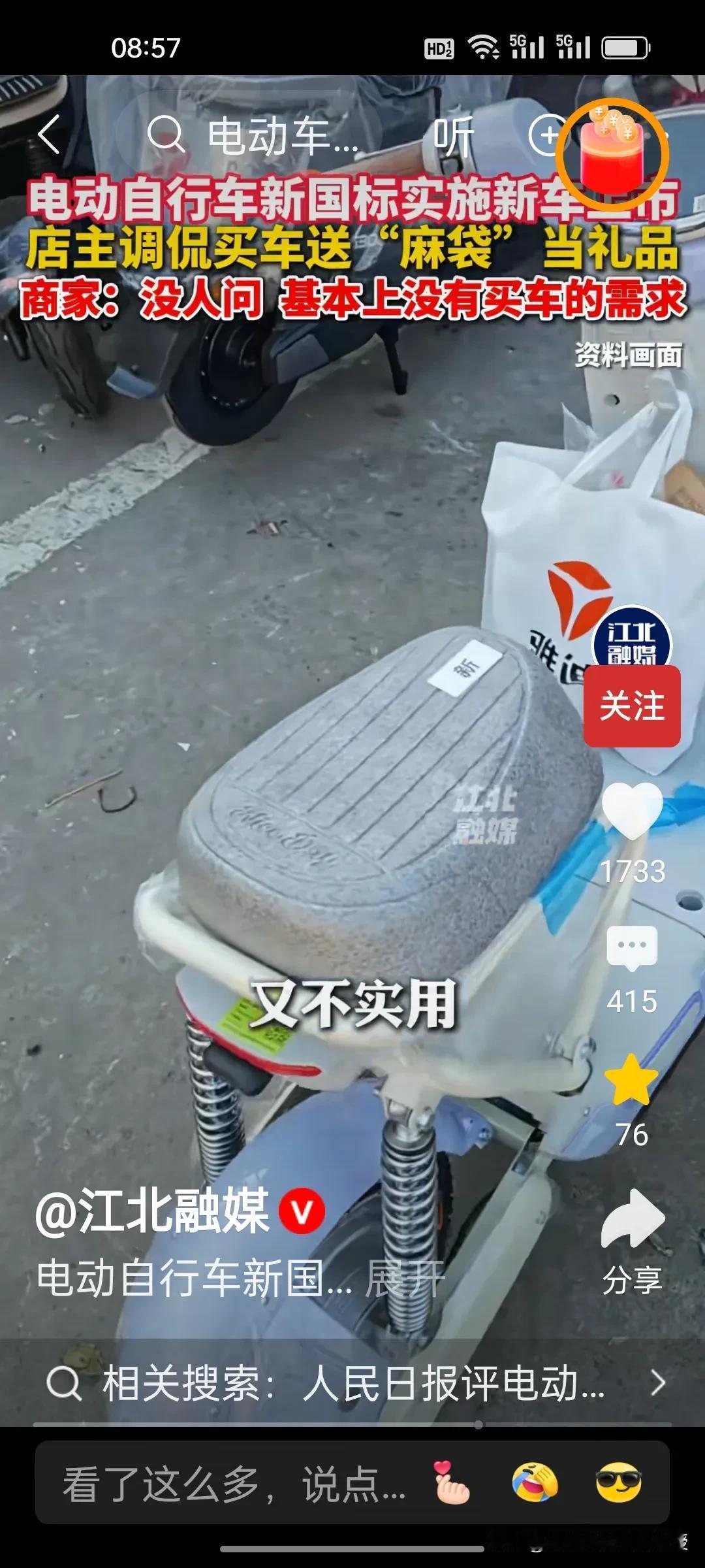 新国标电动自行车卖不动怎么办?根据《江北融媒》视频报道,这位商家琢磨着给潜在消费者送麻袋。这位店主向记者展示,自己将头盔,充电器,雨衣放在麻袋上,然后把麻袋系在座位后面的铁杆上。商家这么一番操作纯属调侃,他说店里没生意,没人来买车。有点担心要是新国标车销量一直不佳,这些商家会不会经营不下去关门呢?