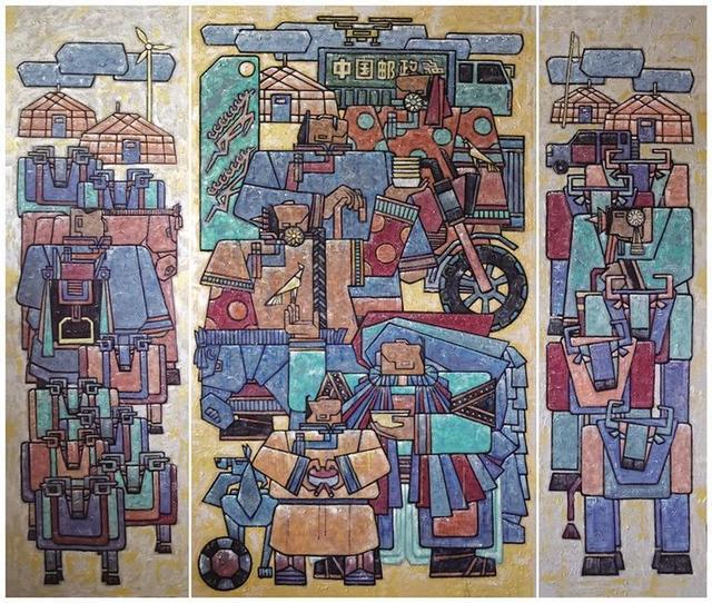 中国壁画学会会员、青年艺术家乌日古嘎的壁画作品《中国梦·草原梦》高240厘米、宽280厘米,是他2025年创作的。《中国梦·草原梦》以草原人民幸福生活为创作源泉,融合了平面化语言、几何造型和装饰性图案等艺术手法,运用矿物质颜料、中国画颜料、丙烯颜料、立德粉、石英砂、白乳胶、亚麻布等多种材料,绘制了一幅以草原上的幸福一家为主题的壁画作品。画面中,儿童手里拿着无人机遥控器在定格家乡的美丽风景,孩子的父母和爷爷奶奶抬头仰望着天空中飞行的金色无人机,享受着天伦之乐,感受着祖国科技发达的力量,远处背景描绘了中国邮政车辆,增加时代感,两侧则描绘了牛羊等牲畜。此壁画作品生动展现草原人民在祖国广袤土地上怀抱美好梦想幸福生活的场景。