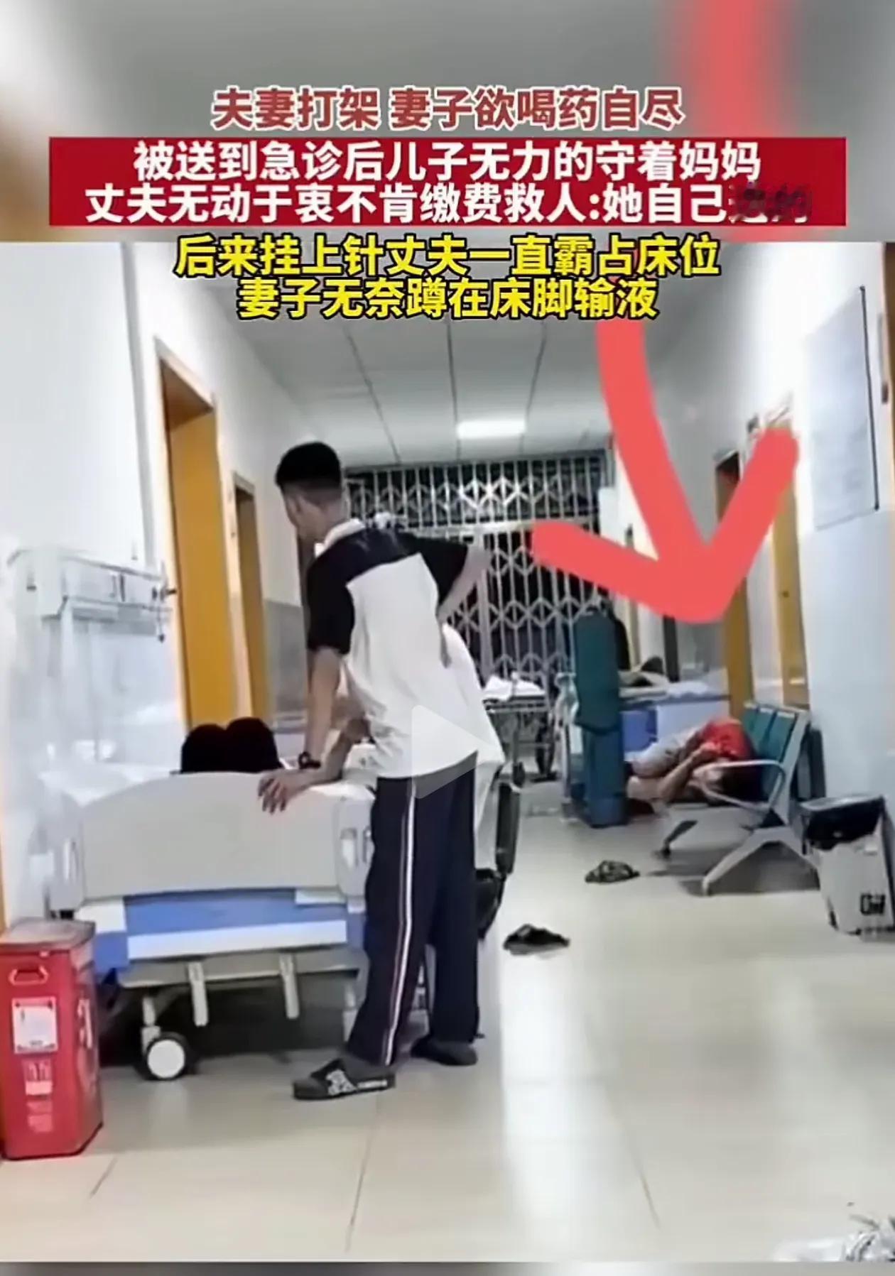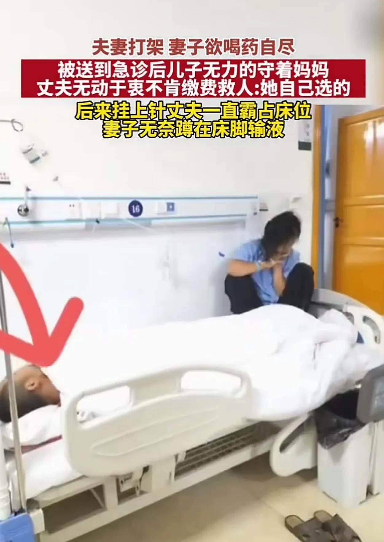 一对夫妻吵架,妻子欲喝药自尽,被送到急诊后儿子守在一旁,丈夫无动于衷不肯去缴费,说是她自己的选择,后来挂上针后丈夫一直霸占床位,妻子只能缩在床脚输液。 对于这种不心疼自己的男人,女人真的太蠢了。 就算男人心疼,命是自己的啊。 夫妻过日子不管对错,都会有吵架的时候,就算再气,也不应该拿自己的生命开玩笑。 遇到这种无情、不知道疼人的男人,这女子也是够苦的了。 这样的男人值得你牺牲自己的生命吗?早日离婚把自己过的更好。 所以永远不要在别人世界里找定位,你的位置,低到无法想象,自己好好爱自己才是最好的最正确的定位。