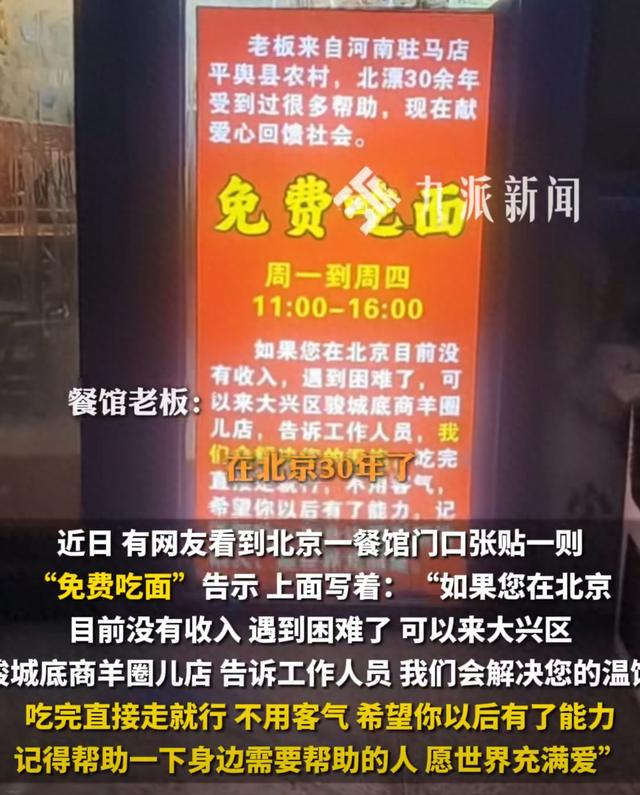 12月4日,九派新闻记者联系上该餐馆老板杨先生,他表示,自己来自河南驻马店,目前在北京大兴区经营这家羊蝎子店,周一到周四中午11点到下午四点,有困难的人可以免费吃一碗河南烩面。杨先生说,自己已经在北京打拼三十年,期间受到过很多帮助,现在有了能力,便想帮助困难的人。(九派新闻)
