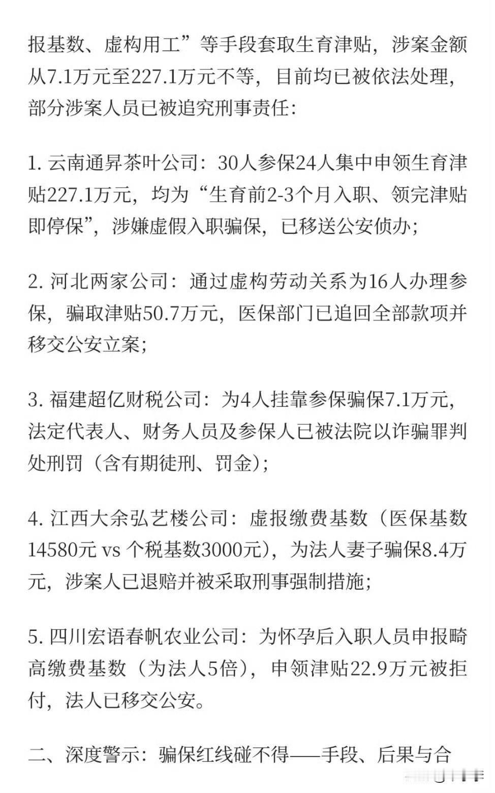 生育补贴还没有完全发放完,“奸商”就嗅到了“商机”!! 云南一公司参保登记共30人,却有24人集中申领生育津贴,总额达227.1万元。这24人都是生育前2 - 3个月才转入该公司参保,参保时月平均缴费基数高达1.7万元,远超当地同类岗位实际工资水平,等申领完津贴后就立刻办理停保,明显是通过虚假入职、虚报缴费基数的方式骗取生育津贴