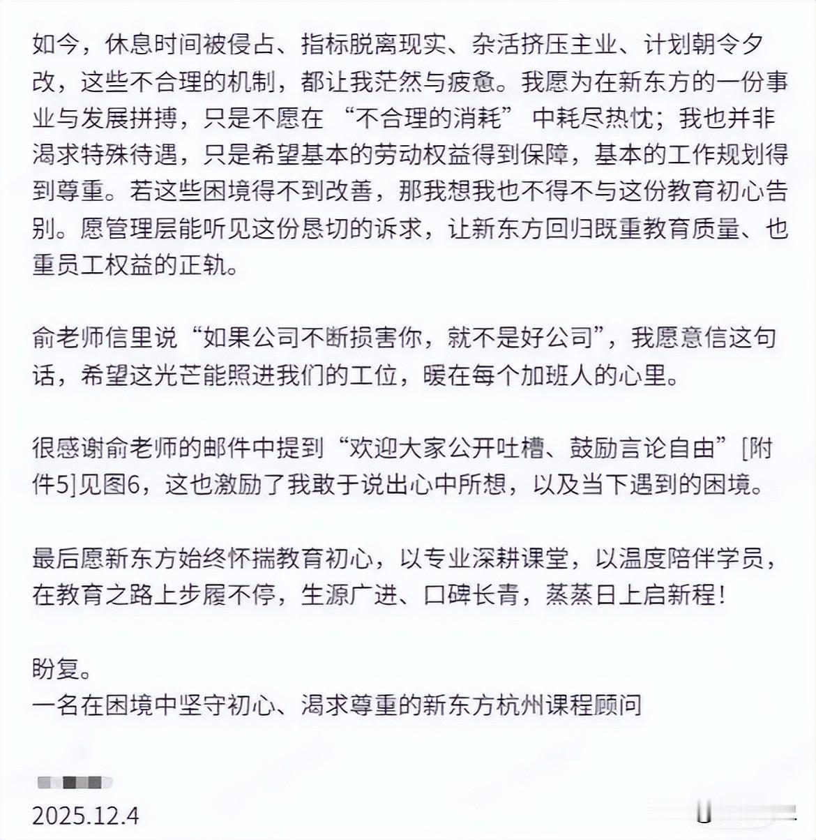 新东方一员工给全体同事发消息吐槽“加班成奴”,账号被秒封,杭州新东方:其违反集团内部举报机制。[嘘] 近日新东方集团内部因一封员工信而掀起波澜,一位杭州的课程顾问在读完董事长俞敏洪的公开信后,通过公司系统向全体同事发送了一封长文。 他在信中直言,虽然被公开信中强调的价值观所感动,但回到现实,迎接他的却是“明天继续早到”、“本周单休”的工作通知,以及看起来难以完成的招生指标。 他描述,从秋季开始,团队就陷入了近乎“996单休”的状态,每天工作超过十二小时成了家常便饭,入职合同上明确的双休日,在实际中已寥寥无几,不合理的指标、临时增加的杂务,让他感到身心俱疲。 这封信很快流传到外部社交平台,但更引人注目的是后续,信件发出后不久,便从内部系统消失,发布者的账号也随即被限制登录,有内部员工向媒体证实了这一情况。 对此杭州新东方学校作出了回应,他们承认有员工发布了“不当言论”,并指出其行为“违反了公司内部信息发布及举报反馈的相关规定”,公司表示,内部设有正规的反馈渠道,鼓励员工通过既定流程反映问题。 新东方员工一封“加班成奴”的全员信,在网上掀起了不小水花,这事儿不光让打工人看了心有戚戚,评论区更是金句频出,各种角度的讨论都冒出来了。 “合同上写双休,实际上996,这不就是打工人的日常吗?区别只在于敢不敢说,说了之后号还在不在。” “上一秒老板还在南极呼吁‘言论自由’,下一秒员工的号就没了,这执行效率,要是用在改善工作上该多好。” “新东方这公关反应速度,值得所有公司学习,当然,是学反面教材。” “这事儿得两说,员工压力大值得同情,但用发全员信的方式确实不合适,相当于把内部矛盾公开化、对抗化,任何公司都不可能容忍,有问题应该走正常反馈渠道。” “如果正常渠道有用,谁会走这一步?不就是因为说了没用吗?”支持方则认为:“不管有没有用,破坏规则就要承担后果,这是职场基本逻辑。” “老板在冰天雪地的南极谈‘初心’和‘以人为本’,员工在热火朝天的加班中当‘奴隶’,这画面太有戏剧性了,建议拍成短片。” “重点不是南极,而是老板在‘远方’谈情怀,员工在‘眼前’扛压力,这种距离感本身就说明了很多问题。” 如果你在工作中遇到类似不合理的情况,你觉得是默默忍受、通过正规渠道反馈,还是也会考虑更激烈的表达方式?从管理者的角度看,除了“秒封”账号,你觉得有没有更好的处理方法,既能维护公司秩序,又能真正听到员工的声音?在评论区聊聊你的选择和看法吧。 信息来源:极目新闻