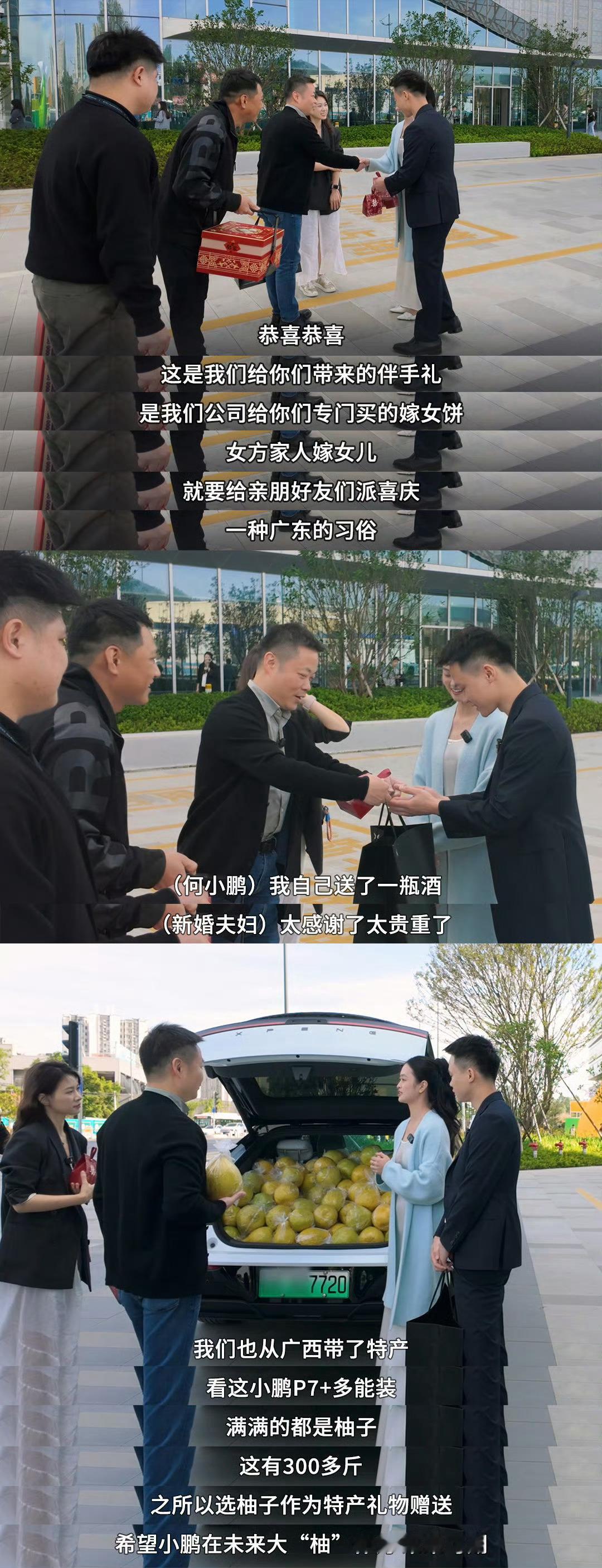 所以说,缘分这种事真挺妙的。两个人在小鹏车友群里偶然认识,聊着聊着发现连名字里都带着同一个“七”字。后来,他们用一队小鹏P7+做婚车,结了婚。最近小俩口还特意开车去给何小鹏送喜糖,何小鹏也开心地回赠了酒和喜饼,这大概算是“网友奔现”的最高境界了吧。何小鹏送P7+新婚车主嫁女饼新婚车主奔赴千里给何小鹏送喜糖