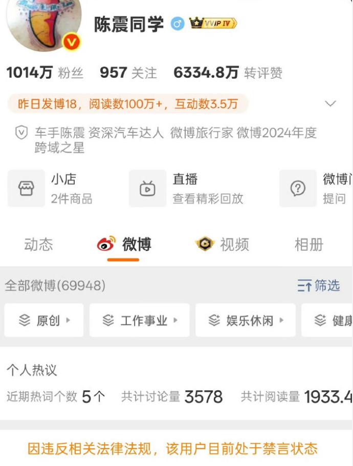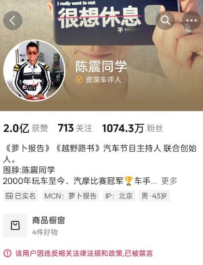 又一位网红被禁言了。 就在12月4日晚上,超240万粉丝的网红陈震被多平台禁言, 抖音平台显示,“该用户因违反相关法律法规和政策,已被禁言。” 小红书平台显示,“该账号因违反相关社区规则,已被禁言。” 具体的原因,尚不可知。 有猜测认为是因为之前的小米捐款事件,但这仅仅是猜测,没有实际的证据。虽然陈震曾多次发文,被指是内涵小米。 陈震与小米有着长期矛盾,从SU7评测被指“双标”(对比豪车挑刺)、公开宣布停用小米手机,到指责小米未支付合作回报,双方关系持续恶化。 近年从专业车评转向“争议引流”,频繁挂网友、煽动对立,被批“毒流量驱动”。 但不管是什么原因,陈震这回可算是能够好好休息一番了。 这回他也算是被流量反噬了。当言论失范超越承载力时,舆论熵增必然触发监管回收。 这件事也给诸多大V提个醒,粉丝越多,责任越重,说话做事可得守规矩、讲分寸。