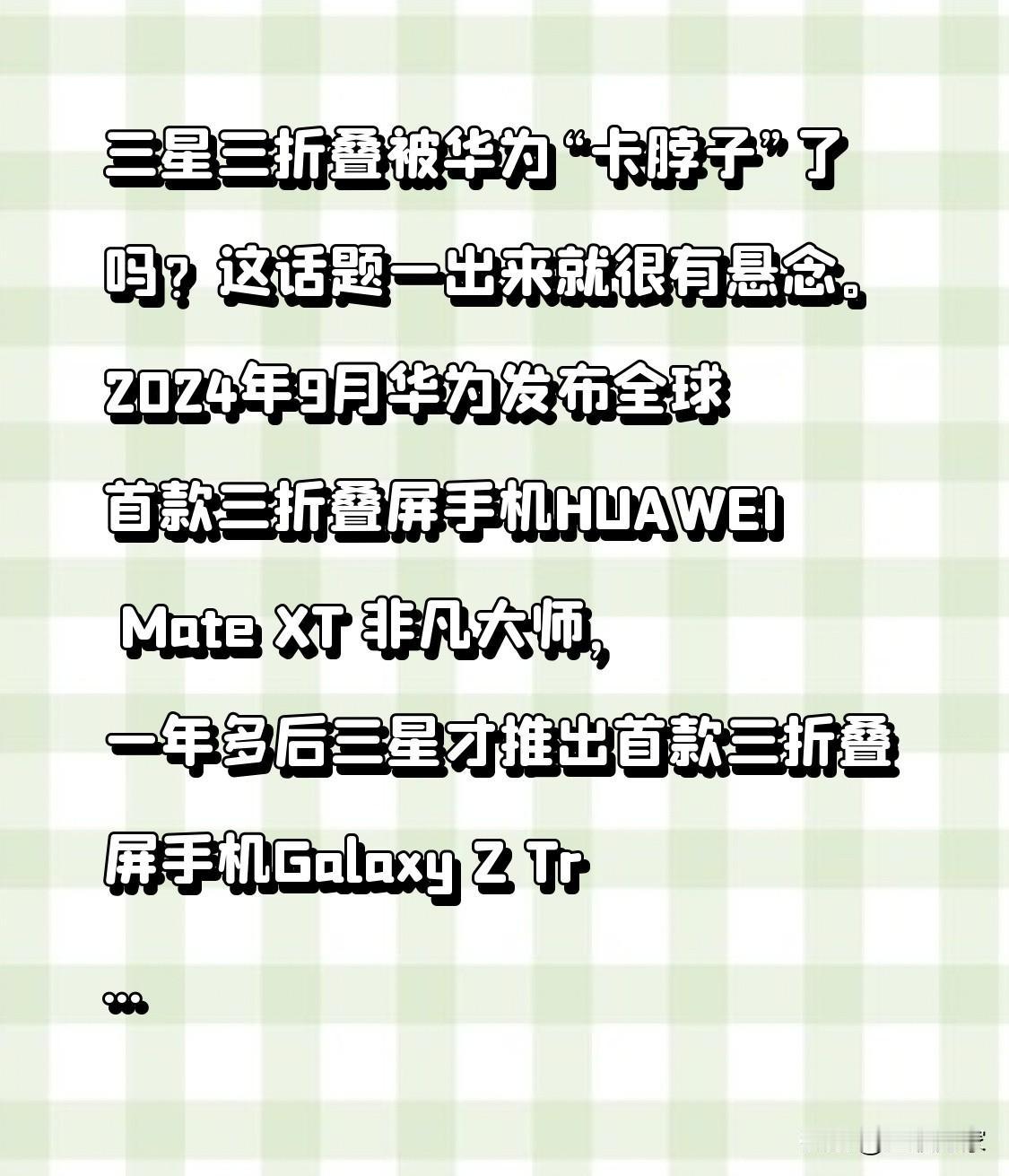 三星三折叠被华为“卡脖子”了吗?这话题一出来就很有悬念。2024年9月华为发布全球首款三折叠屏手机HUAWEI Mate XT 非凡大师,一年多后三星才推出首款三折叠屏手机Galaxy Z TriFold。二者产品形态和折叠方案差异明显,华为单块内屏三段折叠,三星多了独立外屏;华为“Z”形折叠,三星“G”形全内折。 有说法称三星原定“Z”形方案因侵犯华为专利,最后改成“G”形,还影响了屏幕平整度、增加了重量。目前对比来看,觉得三星逊色的声音更多。三星这是创新还是无奈妥协?三星三折叠到底有没有被华为“卡脖子”,大家怎么看?三折叠手机 三星折叠旗舰 折叠屏手机华为 华为三折叠手机 三折叠手机 三星折叠旗舰 折叠屏手机华为 华为三折叠手机 三折叠屏手机 折叠三星 华为三折叠