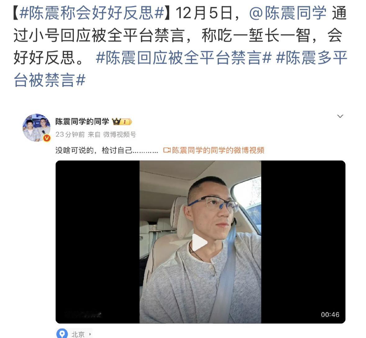 网上大家都在吃瓜 听说这位朋友全网被封,还真是,目前大的社交平台的个人账号都处于封禁了~ 他又干嘛了~ 开车逆行撞车这事儿过去了,又去搞谁了? 陈震全网被封 陈震车评