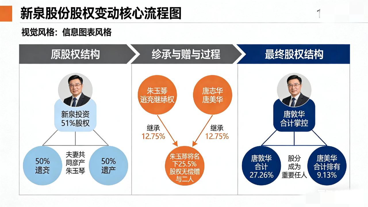 22亿股权无偿赠与!80岁创业大佬逝世后,妻子放弃继承权,儿子接掌百亿车企 2025年12月3日晚间,新泉股份(603179.SH)一则公告引发资本市场广泛关注。公告披露,公司实际控制人、创始人之一唐敖齐先生已于10月26日逝世,其配偶朱玉琴女士作出了一个令人动容的决定:放弃全部遗产继承权,并将名下价值约22.18亿元的股权无偿赠与一双儿女,最终由儿子唐志华正式接过家族企业的掌舵权。 这起股权变动背后,是一段横跨四十余年的创业传奇。生于1945年的唐敖齐,是改革开放后江苏最早一批敢闯敢试的企业家。1982年,他靠着村民卖猪凑的4000元启动资金,在三间拖拉机房里开启了创业之路,1993年与儿子唐志华共同创办新泉股份前身,一步步将小作坊打造成国内汽车内饰领域的龙头企业。如今的新泉股份已在上海主板上市,位列中国汽车供应链百强第50位,不仅是特斯拉、吉利、上汽大众等知名车企的核心供应商,更在全球布局19个国内生产基地及多个海外公司,手握409项专利,成为行业技术领先的汽车饰件整体解决方案提供商 。 根据公告细节,唐敖齐持有的新泉投资51%股权属于夫妻共同财产,其中25.5%归朱玉琴所有,剩余25.5%为遗产。在法定继承顺序中,朱玉琴本可与子女共同继承遗产,但她选择完全放弃,由儿子唐志华、女儿唐美华各继承12.75%;同时,她还将自己名下25.5%的股权无偿赠与二人,同样各获12.75%。权益变动后,唐志华通过直接及间接持股合计掌控公司27.26%的股份,正式成为单一实际控制人,而唐美华合计持股8.13%,家族股权实现平稳过渡 。 值得关注的是,现年54岁的唐志华并非空降的"富二代",而是与父亲并肩作战多年的创业伙伴,长期担任公司董事长兼总经理,深度参与企业经营管理,这也为股权交接后的稳定运营奠定了基础。新泉股份明确表示,此次变动不会影响公司日常生产经营、管理层结构及核心业务布局,目前公司业绩稳健增长,2025年前三季度营收达114.13亿元,同比增长18.83%,同时正通过收购拓展汽车座椅业务,并设立全资子公司切入智能机器人赛道,全球化战略稳步推进 。 截至12月5日,新泉股份股价报70.05元,总市值达357.35亿元,市场用平稳走势回应了此次家族传承。朱玉琴女士无偿赠与22亿股权的举动,不仅避免了家族企业常见的继承纠纷,更展现了老一辈企业家家庭的格局与智慧。对于新泉股份而言,在唐志华的带领下,这家承载着两代人心血的企业,正带着稳健的经营基本面和清晰的战略布局,迈向全球化与智能化的新征程。资本市场也期待,这场平稳有序的传承,能让企业在汽车产业变革浪潮中持续领跑。