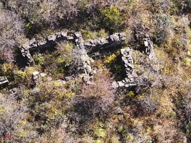 白鹿山崖壁陡峭,只有一条羊肠小道可达山顶,路险难行,人迹罕至。“四普”工作中,为了获取更全面的信息,考古人员携带测量仪、无人机等设备攀爬上山。山上荆棘丛生、灌木疯长,在白鹿山山顶的向阳面,“四普”队员发现150余间石砌房屋隐藏在茂盛的植被中。这些房屋依据地形特点建造,散落分布,绵延200余米。石屋有连体、并排排列,有单间也有套间,均由不规整的片状毛石砌筑。石砌墙体最高处2米多,部分建筑上面尚存大石板封顶。部分石屋内有通气窗、壁龛、火炕等。公共区域还有多处石臼和石磨。另外,寨子周边还建有寨墙、瞭望口、垛口等明显的防御设施,为探讨寨子的性质提供了实物依据。