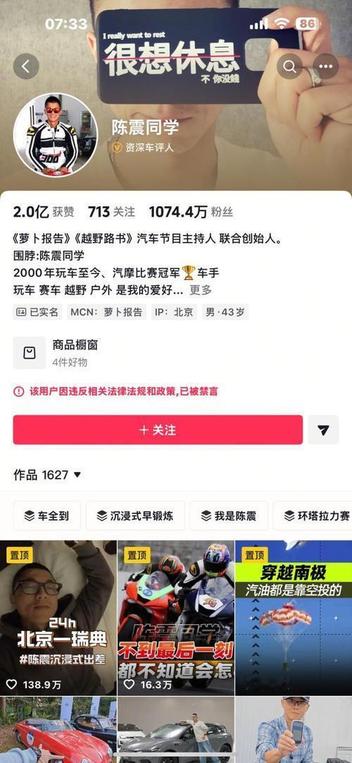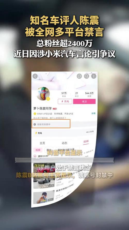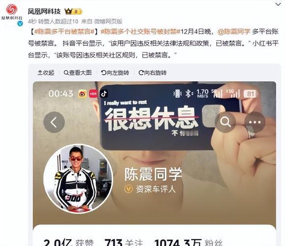 大V陈震一夜“凉凉”?超2400万粉丝,多个平台账号竟同时被禁言!从抖音、快手到B站、小红书,无一幸免,微博也一度中招。这位车评界顶流,前不久刚因劳斯莱斯车祸道歉,近日又因点评小米捐款言论陷入争议,被指“阴阳怪气”。虽紧急解释致歉,但网友似乎不买账。如今全网禁言,评论区彻底安静了。网红之路不易,且行且珍惜啊!吃瓜群众:这次,是真翻车了?