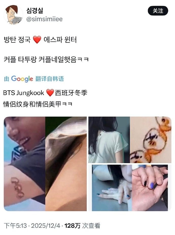 HYBE回应田柾国金冬天恋情传闻近日,韩国艺人田柾国和金冬天Winter被曝恋情传闻。对此,田柾国所在经纪公司HYBE于12月5日上午回应:“正在确认中。”此前,在各大社交媒体平台和网络论坛上,有大量的证据被公开,证明田柾国和Winter已经交往了数月。据悉,两人拥有相似的小狗图案纹身,并且情侣同款泛滥,包括手链、短裤、耳返和美甲。此外,田柾国在服兵役休假期间前往观看aespa的演出也被列为证据之一。此外,田柾国的Instagram 账号 ID 为 'mnijungkook',虽然他本人称是 'my name is jungkook' 的缩写,但如果将 'n' 和 'i' 互换,就会变成 '민정국 (Min J-Kook)'(注:此处指 Winter 本名金玟庭 Kim Min-jeong 和柾国的名字组合)。目前,金冬天Winter方尚未回应。田柾国 金冬天