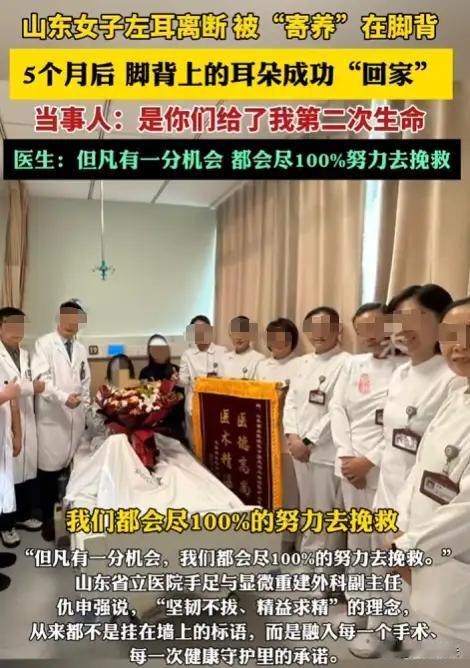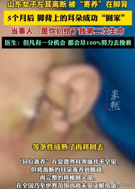 实施这台神奇手术的是山东第一医科大学附属省立医院手足与显微重建外科仇申强团队 。整个技术过程分两阶段,核心是超显微血管吻合的“异位寄养再植术”,具体步骤如下 : 1. 第一阶段:脚背寄养,搭建临时生命通道 医生先清创分离出健康的离断左耳,因它可供吻合的血管仅0.2 - 0.3毫米粗,且头部创面血管受损严重无法原位再植,便选脚背当“寄养床”(皮肤厚度、血管口径都和耳部匹配)。随后在放大40倍的显微镜下,用比头发丝还细的缝线,把左耳血管和脚背血管精准吻合。这场手术耗时10小时,术后第5天左耳出现静脉危象变紫,医护人员每15分钟放血一次稳住血运。之后头部回植的头皮坏死,医生又从孙女士腹部取皮移植,成功覆盖裸露颅骨。 2. 第二阶段:五个月后回迁,重建头部血供神经 待脚背的左耳稳定成活、头部移植皮肤愈合变软后,10月中旬开展回迁手术。医生先从脚背完整游离出左耳的1条动脉、3条静脉和1条神经并携带皮瓣,再在头部疤痕组织中仔细梳理分离出匹配的血管神经。接着再次通过超显微技术将两者精准吻合,重建血液循环和神经连接。历经6小时手术,左耳成功“回家”,术后医护人员每小时监测耳廓血运,确保其稳定成活。断指再植技术 断肢异位寄养 断肢再接术 素材取于网络,侵权删除。