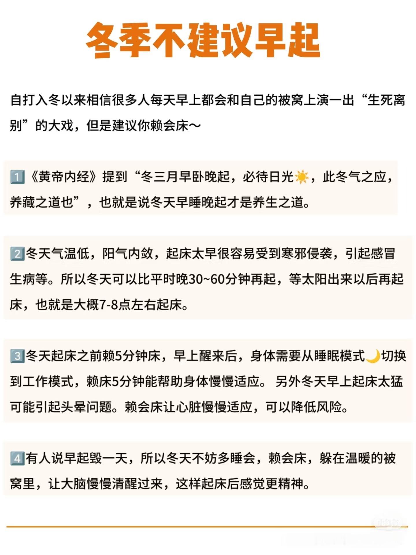 冬天起床不要太猛中医,建议大家冬天不要早起!冬天晚起的好处顺应自然:冬天早睡晚起,顺应自然界阳气内敛的规律,是养生之道。避免寒邪:晚起可以避免早晨的寒气,减少感冒生病的风险。健康养生:赖末5分钟,有助于身体慢慢适应,降低血压波动带来的健康风险。精神饱满:多睡一会儿,让大脑慢慢清醒,起床后感觉更精神。冬天来了,不妨顺应自然,给自己更多的休息和温暖。晚起会儿,赖一会儿床,享受冬日的傭懒和温暖。冬天起床不要太猛