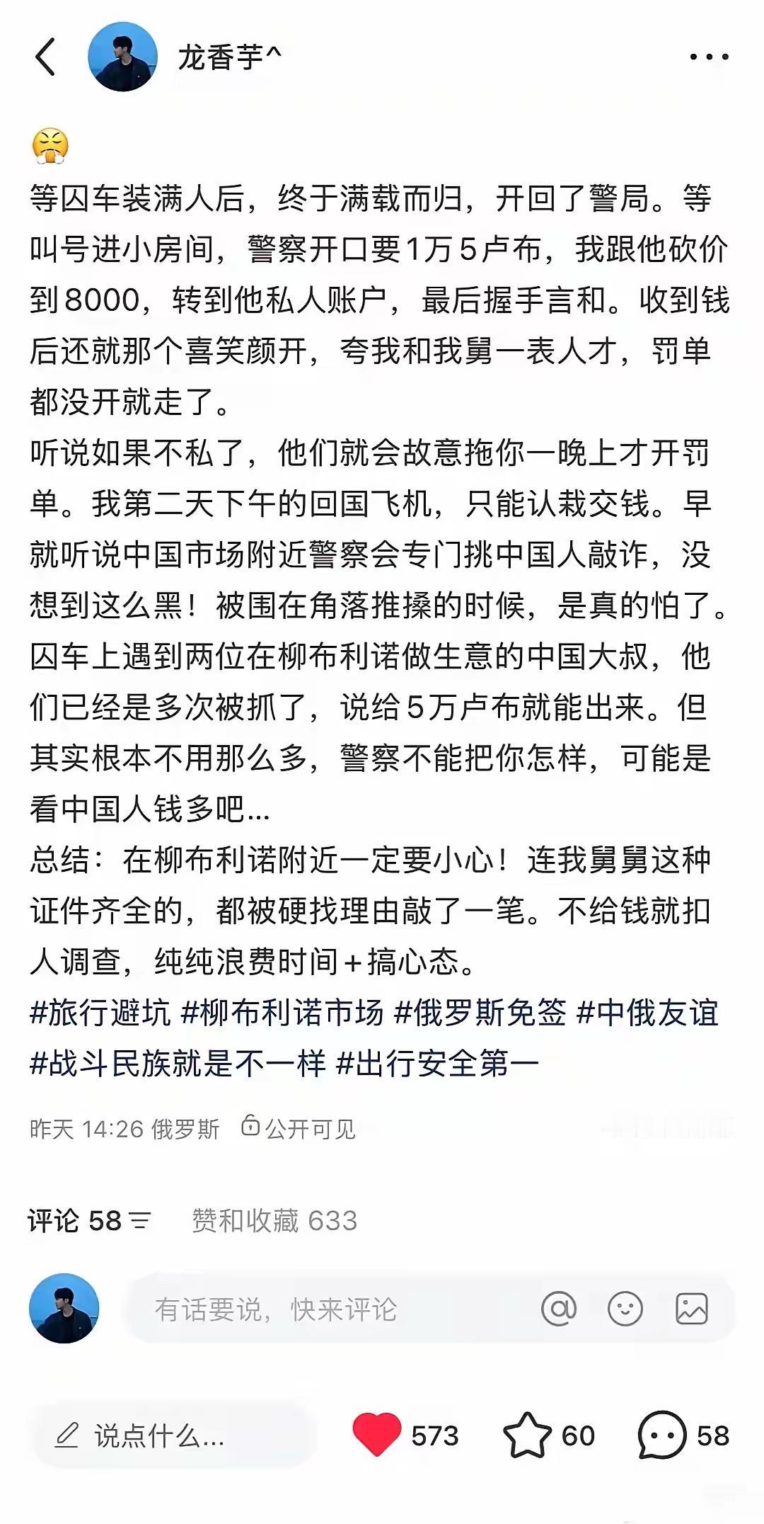 8K卢布坐囚车,当地导游现身说法。 这种事确实在哪都有,并不是大鹅独有,问问去过东南亚各国的,国人几乎成了行走的ATM机,在欧洲,小偷也乐意向亚洲面孔下手,新闻上都有报道啊。关键还是太年轻,别人说什么,就信什么,现实和理论的差距,不是几条街的距离。