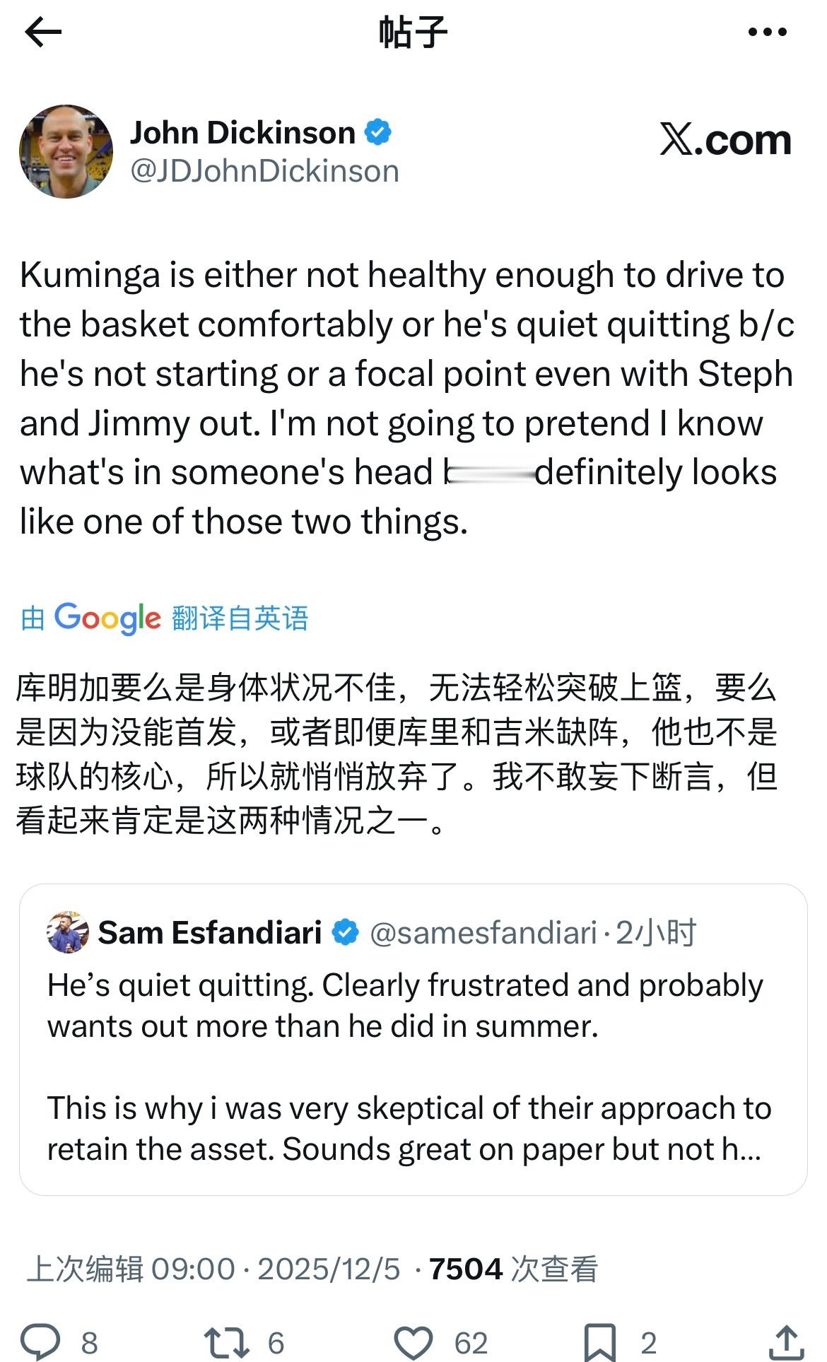 库明加要么是身体状况不佳,无法轻松突破上篮,要么是因为没能首发,或者即便库里和吉米缺阵,他也不是球队的核心,所以就悄悄放弃了。我不敢妄下断言,但看起来肯定是这两种情况之一。勇士vs76人埃奇库姆补篮绝杀勇士