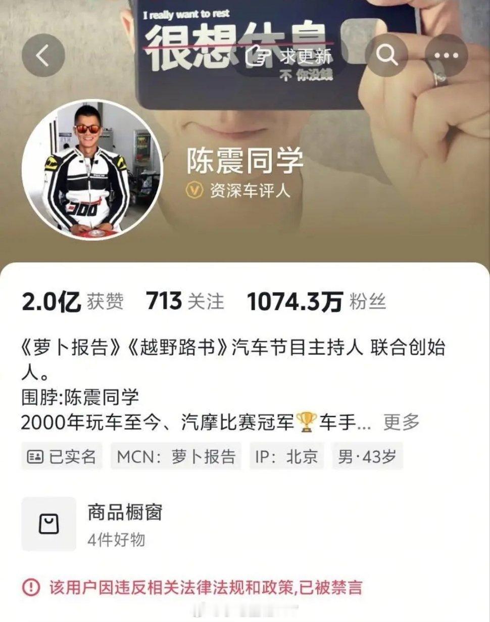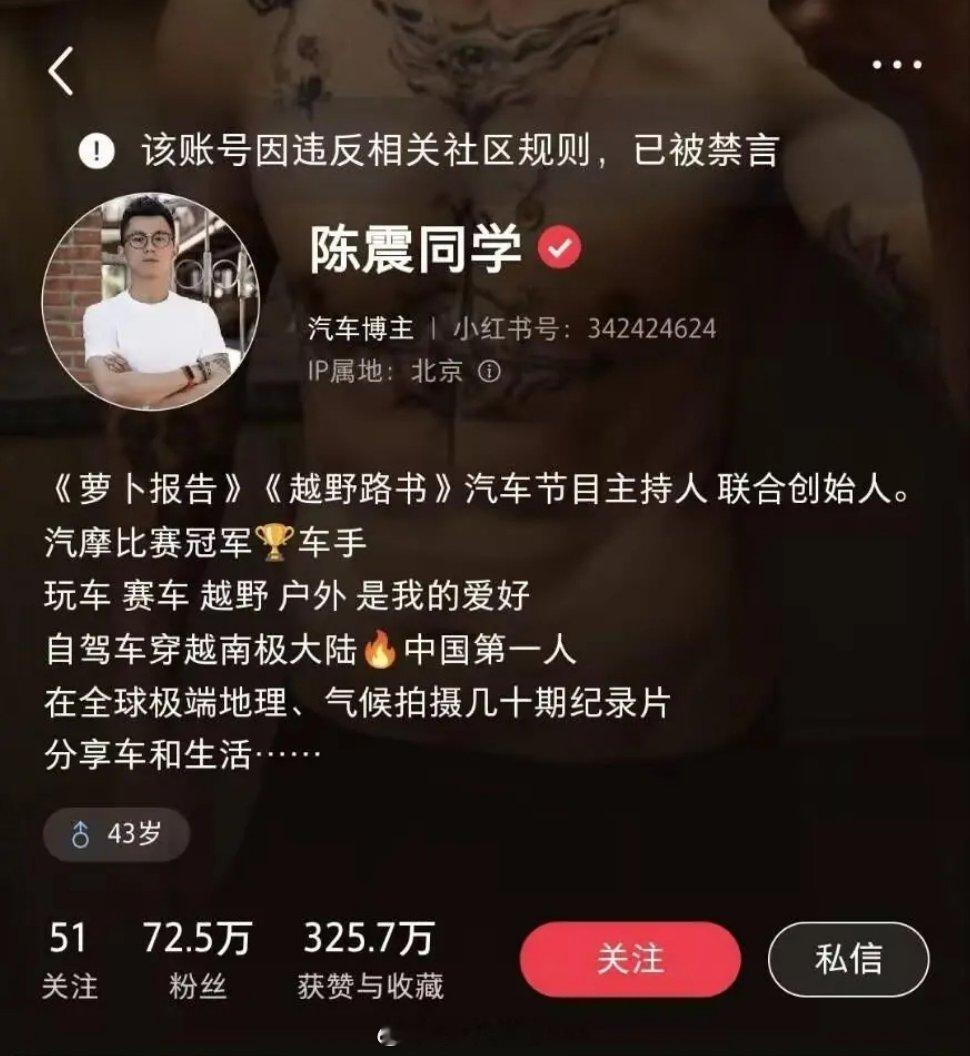 陈震多平台被禁言全网拥有2400多万粉丝的陈震多平台账号被禁言,抖音、快手、小红书平台显示,该用户因违反相关法律法规和政策,已被禁言。B站则显示其账号已被封禁。微博账号短暂禁言后又恢复正常。陈震在微博有1014万粉丝、抖音1074.3万粉丝、B站57万粉丝、小红书72.5万粉丝、快手201万粉丝。近日,陈震在网络上比较活跃,曾因涉某电动汽车品牌的言论引争议。11月27日上午,“小米公益基金会”官微宣布,香港小米基金会捐赠1000万港元,紧急驰援香港大埔火灾救援。随后陈震发布微博称:不管出于什么原因,但这事本身没得黑,点赞~然而正是这条帖子让他陷入非常大的争议里,不少人吐槽他是在阴阳小米捐款,有其他博主更是直言他天天蹭小米的热度。此事发生后同样也形成了微博热搜话题,众多博主、网友纷纷参与,观点也是五花八门。他还表示,小米和特斯拉都是网红车,而自己也是个网红,网红聊聊网红车有啥问题吗?随后没多久,他再发布微博就之前表述致歉,称“第一条微博表述不清,道歉。”陈震回应被禁言,因为此前的言语过于激烈了,作为一个大V需要给大家传递正能量,检讨自己反思一下。陈震全网粉丝超2400万陈震回应被全平台禁言