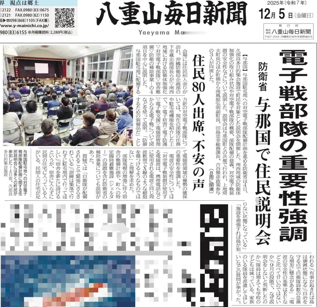 日本计划明年向距离中国台湾近100多公里的琉球与那国岛部署攻击型“对空电子战”部队,用以干扰中国人民解放军的预警机等飞机的雷达,当地媒体称(日本)政府以中国动向为假想背景,持续推进西南诸岛地区的防卫体制强化。防卫省也在与那国町推进驻屯地建设,并于2024年3月配置电子战部队,不过现有部队主要承担电磁情报搜集与解析、利用电磁波进行舰船警戒监视等任务。连同熊本市健军驻屯地,日本政府计划在2026年度额外部署“对空电子战部队”。该部队则将用于使敌方的预警管制机等在空中的机载系统失效,是日本国内首次设立的此类部队。每天认识一件兵器烽火问鼎计划 12月4日,日本防卫省和与那国町召开关于陆上自卫队“对空电子战部队”增加部署的居民说明会,该岛目前仅有1700名居民,防卫省则计划将自卫队数量增加到260人。不少居民提出担忧:“如果遭到他国攻击怎么办?”“我们还能在这个岛上住多久?”——对紧急事态的恐惧不断被提起。也有赞成部署的居民提出,希望能配备可以拦截他国导弹的装备。一名当地女性首先发问:“增强自卫队的最终目的是什么?” 防卫省官员不断强调“反制能力”的必要性。这位女性反驳道:“为了所谓的反制能力,我们被迫一直处于(担心突发事态的)紧张之中。为什么要做战争准备?税金应该用来帮助那些真正困苦的人。”一名当地男性则表示:“今天已经听了多少次‘保护’这个词?如果真的发生了什么,最终牺牲的还是我们居民。请把风险也讲清楚。”尽管超过预定结束时间晚上8点半,居民仍不断举手,向防卫省提出疑问。一些居民表达了他们的担忧,例如:“自卫队部署让我们一直处于紧张之中。”“我希望训练在基地内进行,而不是在村子里。”“明明要建新宿舍,却有自卫队员不住宿舍而住民宅,导致民宅紧缺。”“设施一旦扩充,本岛就会成为攻击目标。”“若发生有事,本岛会被彻底摧毁。”“电磁波的安全标准,相比欧盟是不是更宽松?”“人口减少、孩子也在减少,请派遣有家庭的队员。”防卫省官员回应称:“向对方展示我国拥有保护国家的实力是非常重要的。”在电磁波安全性方面,防卫省说明:“对空电子战装置使用的电磁波,与手机等设备所使用的频段相同,并非像X射线那样会损伤细胞的东西。”并呼吁居民理解。与那国町町长上地恒夫在居民信息说明会后接受了采访。他表示接受对空电子战部队的部署,因为这一决定在前任町长任期内就已经做出。关于防卫省计划部署的中程地对空导弹(中型SAM)部队,虽然部署时间尚未确定,但他表示“目前尚未收到任何具体说明”,并将在充分听取防卫省方面的意见(包括装备的功能)后再做决定。