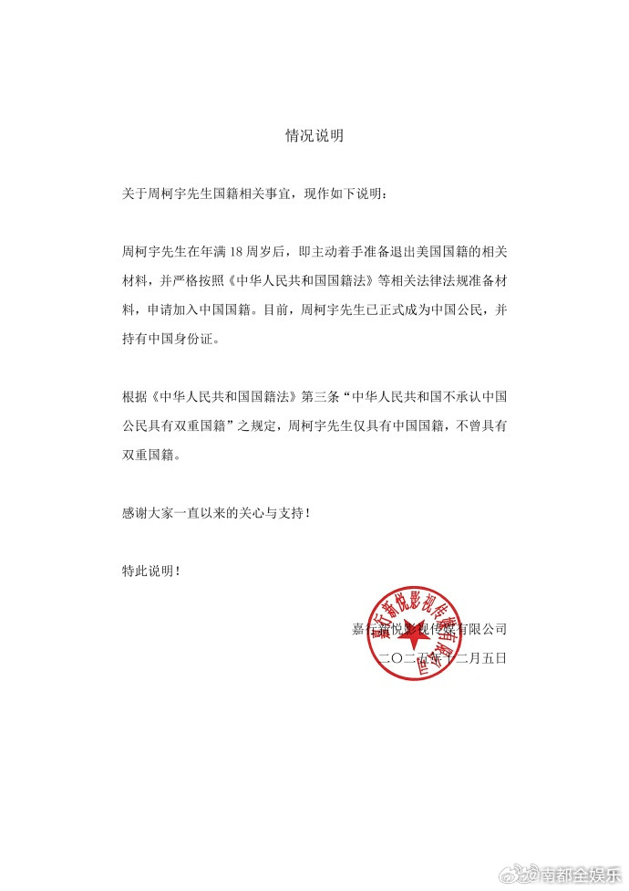 周柯宇工作室回应国籍周柯宇已正式成为中国公民 昨日,主演《狙击蝴蝶》开播,网友发现片尾他的名字没有了国籍标注。今日,发声明回应,周柯宇在年满18周岁后,即主动着手准备退出美国国籍的相关材料,已正式成为中国公民,并持有中国身份证。周柯宇 国籍