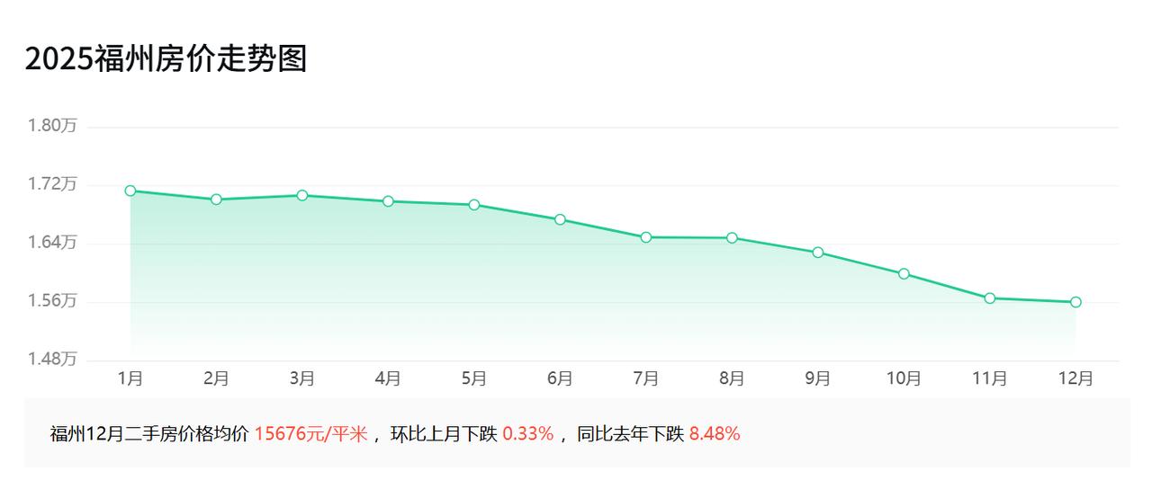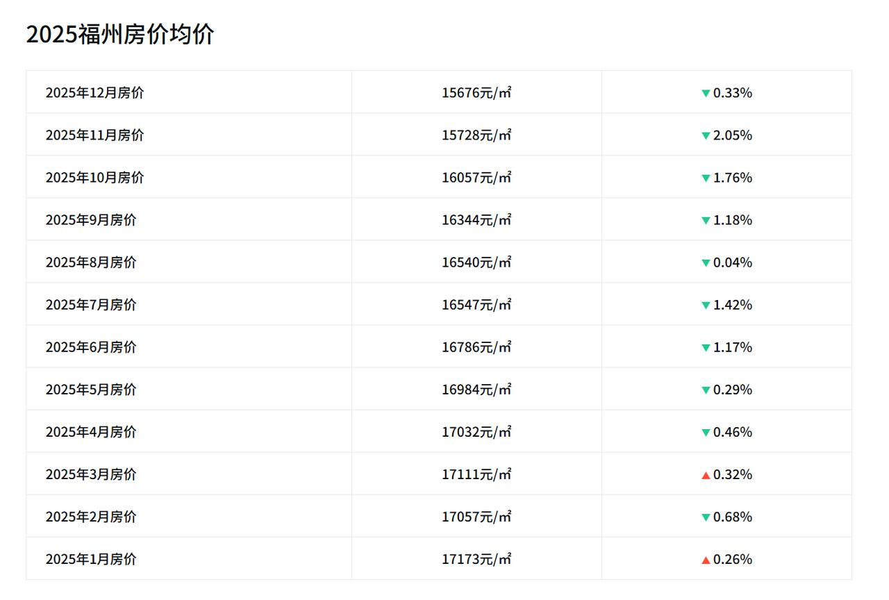 2025年1月,福州二手房均价17173元; 2025年2月,福州二手房均价17057元; 2025年3月,福州二手房均价17111元; 2025年4月,福州二手房均价17032元; 2025年5月,福州二手房均价16984元; 2025年6月,福州二手房均价16786元; 2025年7月,福州二手房均价16547元; 2025年8月,福州二手房均价16540元; 2025年9月,福州二手房均价16344元; 2025年10月,福州二手房均价16057元; 2025年11月,福州二手房均价15728元。 2025年,福州房价算下来,整体跌了差不多8.4%,不过,只看平均数会错过很多细节。比如:像鼓楼区这样的核心区,有顶级学区撑着,价格依然坚挺,均价能到2.5万左右,仓山的江南CBD等新兴板块,发展快,配套跟得上,能吸引年轻刚需,均价在1.8万左右。 其实,福州房价的均价只是反映一个趋势,而更真实的图景是:核心资产在努力站稳,而普通的、同质化严重的房子,正在经历价值的回调。 其实福州房价背后还有几个原因:1、人口增长放缓;2、政策组合拳发力;3、买方持续观望。 总之,2025年1-11月份福州的楼市,已经转向一个更平稳、更强调居住品质和价值的新阶段。