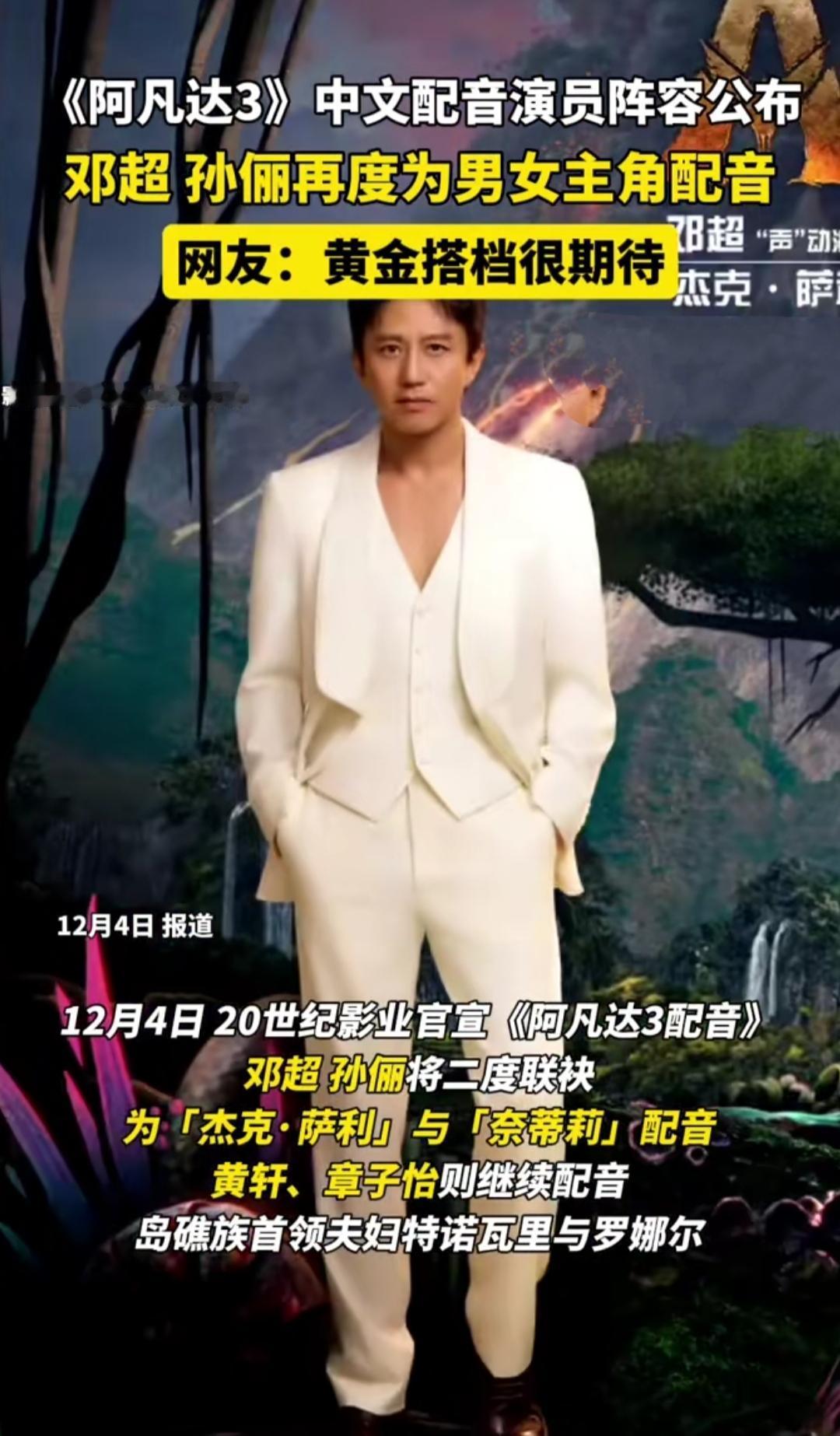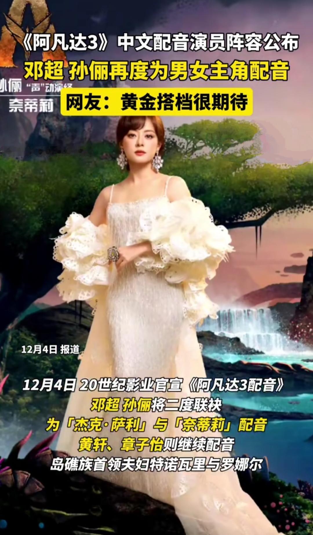 等了这么久的《阿凡达3》终于有新动静!中文配音阵容一官宣,直接戳中影迷的心巴——邓超、孙俪、黄轩、章子怡全员回归,还是熟悉的配方! 一部电影的配音有多重要?当年《水之道》里,邓超配的杰克满是硬汉柔情,孙俪的奈蒂莉爆发力十足,他们的声音早就和角色绑在了一起。原班人马回归,不只是省了磨合的功夫,更是守住了影迷的情怀。 这次影片不仅是同步上映,195分钟的片长还是系列最长,光想想就觉得过瘾。从第一部到现在,一晃这么多年,有人从学生党变成了上班族,不变的是对潘多拉星球的向往。 好故事配好配音,才能让情怀不翻车。12月19日,一起走进影院,再赴这场跨越多年的潘多拉之约,想必不会失望!
