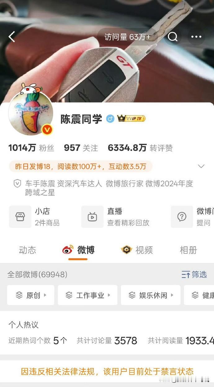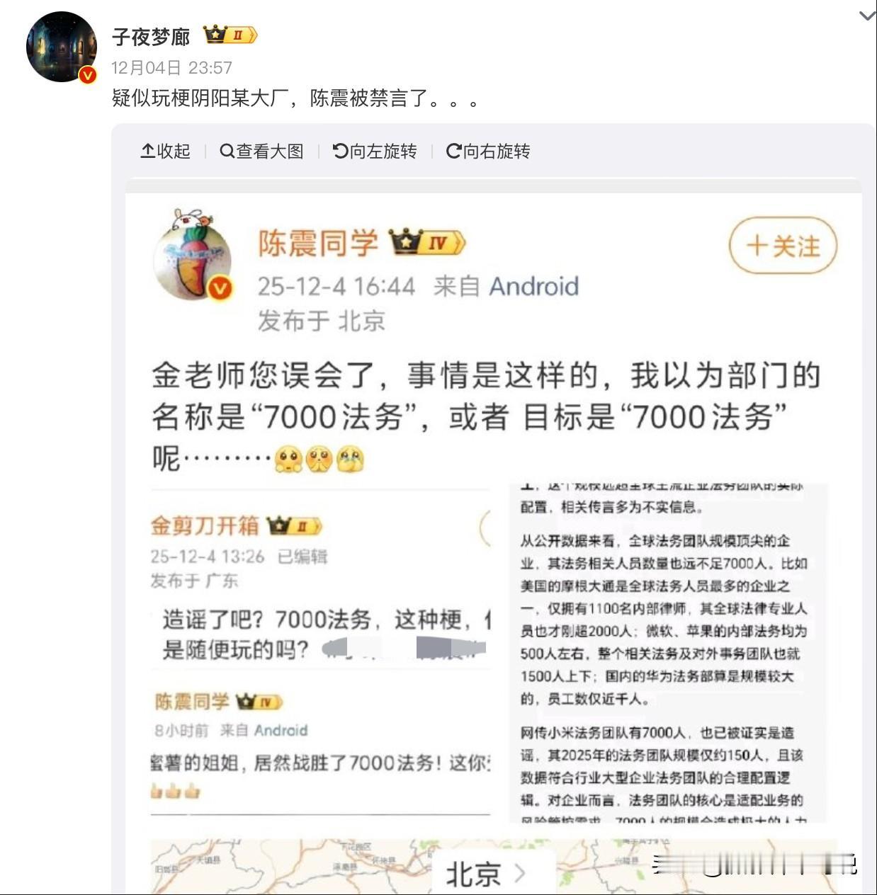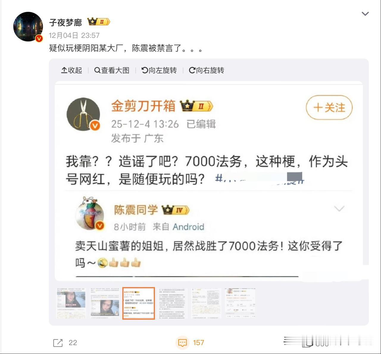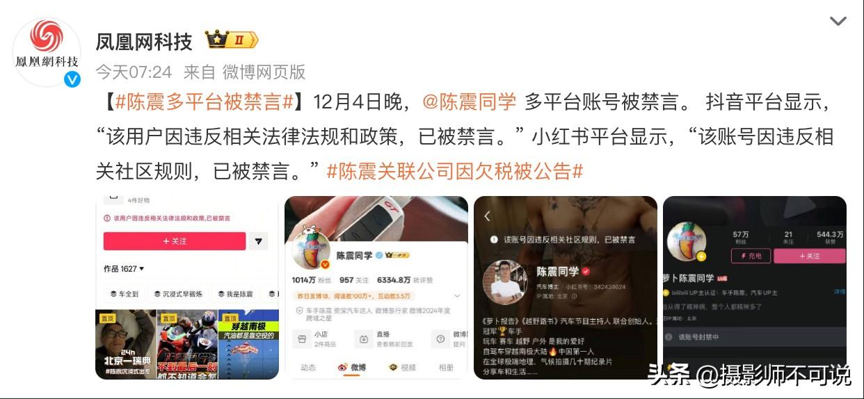 千万网红陈震被多平台禁言来得很突然,之前也关注过他的车评节目,说实话挺有料的。只不过很多事情都比较有话题性,容易引起讨论和争议。这次被大面积禁言很多人都不知道是什么原因,平台提示也只是“违反相关法律法规和政策”,这也看不出什么具体问题。但有网友分析可能是因为之前陈震曾发文阴阳某大厂法务,主要是7000这个数字没啥依据,疑似为造谣。之前就有网友质疑他作为头部大V这样说没有依据,疑似造谣!我去查了一下这个数字,的确没有明确数据来源,头部大V这样调侃的确很容易误导网友。虽然我也不太喜欢某大厂的营销套路,但如果因数据造谣而被禁言,也是无可厚非的。冬日生活打卡季