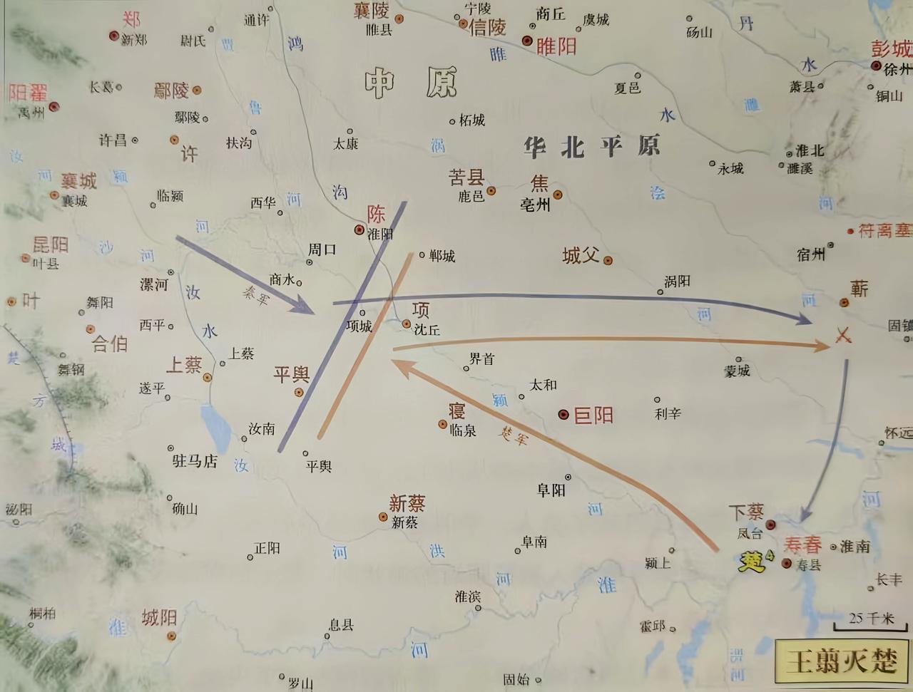 秦国灭楚 灭掉魏国后,前225年,秦国将矛头转向楚国。然而楚国不是三晋,秦王政不敢轻举妄动,问李信:“寡人要取楚国,将军以为要用多少兵马?”李信道:“不过二十万。”秦王政又问王翦,王翦说:“非六十万不可。”秦王政想,王翦老了,这么胆小,还是李将军年轻勇猛。于是,秦王命李信和蒙恬率二十万大军攻打楚国,而王翦称病,告老还乡。 秦军进入楚境后,分兵两路,李信进攻平舆(今河南平舆北),蒙恬进攻寝邑(今安徽临泉),大破楚军,兵锋直指寿春。此时,陈地的楚人造反了,领头的正是昌平君。李信本已到达颖河岸边,准备渡河与楚军作战,听说昌平君造反,立即挥师北上,与蒙恬相约在城父会合。 此时的楚将是项燕,见秦军向北,立即尾随在后,三天三夜不停宿,最终追上,大败李信部秦军,又攻入秦军两个营地,斩杀了七个都尉。得知秦军兵败,秦王政大为震惊,意识到自己用人不当。随后亲自前往王翦的家乡频阳(今陕西富平东北),请王翦出任秦军统帅。王翦推辞,说身体不适,秦王固请,最后王翦说:“如果非要用臣,需六十万大军。”秦王政同意。 出征前后,王翦多次向秦王奏请赐给良田美宅,连部下都觉得过分。王翦却说:“大王生性多疑,如今秦国士兵全在我手,我只有多提要求,让大王觉得我只是贪图钱财,才不会怀疑我拥兵自重。” 前224年,王翦领兵抵达楚境。楚国这边,也调动国内全部兵力,共计四十万,准备迎战秦军。但王翦却下令坚守营寨,就是不出战。项燕多次到秦营挑战,秦军都置之不理。一年后,楚军挑战不成,慢慢松懈,就率军东归了。王翦却趁机率军追击,至蕲县南,大败楚军,项燕自杀。 前223年,王翦和蒙武率军继续南下,攻破楚都寿春,俘虏楚王负刍。楚人拥立昌平君为王,继续在淮南抗秦。但随着秦军南下,昌平君战死,楚国彻底灭亡。 (文中观点与地图摘自李不白《透过地理看历史:战国篇》)