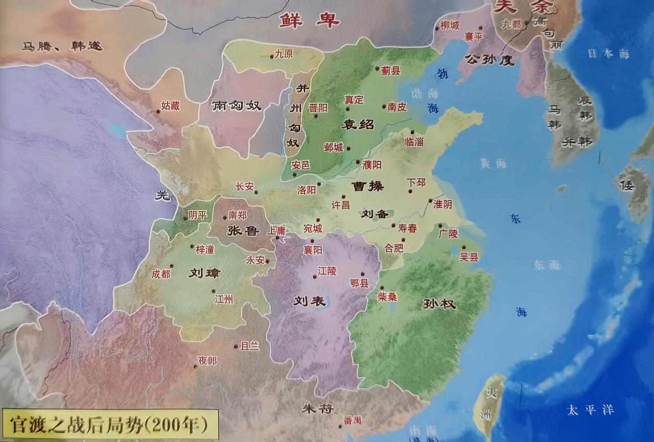 官渡之战 袁绍见曹操挟天子以令诸侯并逐步把势力扩张到黄河以北后,深感不妙,集合十万大军,外加一万骑兵,准备南渡黄河,直取许昌。曹操的兵力不到两万,分成几处防守:刘延一千守白马,于禁两千守延津,其他各处人马也不过一两千,主力人马部署在官渡,由曹操亲自率领。建安五年(200年),官渡之战正式开始。 二月,袁绍进军黎阳,派颜良为先锋渡过黄河,进攻白马。守白马的东郡太守刘延势单力薄,很快被袁军围困。四月,在谋士荀攸的建议下,曹操佯装从延津渡河袭击袁绍的后方。袁绍果然上当,分兵延津。曹操则率领轻骑,以张辽、关羽为先锋迅速赶往白马。关羽于万军之中斩杀颜良,袁军溃败。之后曹操把白马城中百姓清撤一空,沿黄河向西而去,袁绍大军渡河,派文丑和刘备追击曹操。曹操人少,只能使计,他让士兵解鞍放马,又沿路丢弃辎重,引袁军哄抢。曹操令骑兵重新翻身上马,趁乱杀了一个回马枪,袁军大败,文丑也死于乱军之中。 虽然损失了颜良、文丑两员名将,士气大挫,但袁绍兵力仍然占优。曹操不敢妄动,老老实实地回防官渡。八月,袁军主力接近官渡,依沙堆立营,从东往西长达数十里,曹操也立营与袁军对峙。双方在官渡相持三个月,偶有交兵,互有损伤。曹操缺兵少粮,写信给荀彧,想退守许昌,但荀彧劝其坚守,静待奇迹。 当双方相持不下的时候,袁绍手下的谋士许攸突然来投奔曹操。曹操惊喜,光着脚就跑出帐外迎接。许攸向曹操献出一计:偷袭乌巢,烧其粮草。袁绍的粮草辎重都囤积在乌巢,派淳于琼带了上万人把守。曹操亲自带兵偷袭,抄小路过去,围攻放火。袁绍知道后一面派人救援,一面派张郃、高览去攻曹操在官渡的大营。两人久攻不下,听说曹操在乌巢得手,知道大势已去,就投降了。两人一投降,袁绍的军队立即崩溃,仓皇退回河北。曹操趁势掩杀,大获全胜。 这一仗,袁绍损失了七八万人,从此一蹶不振。而官渡之战后,曹操奠定了统一北方的坚实基础。 (文中观点与地图摘自李不白《透过地理看历史:三国篇》)