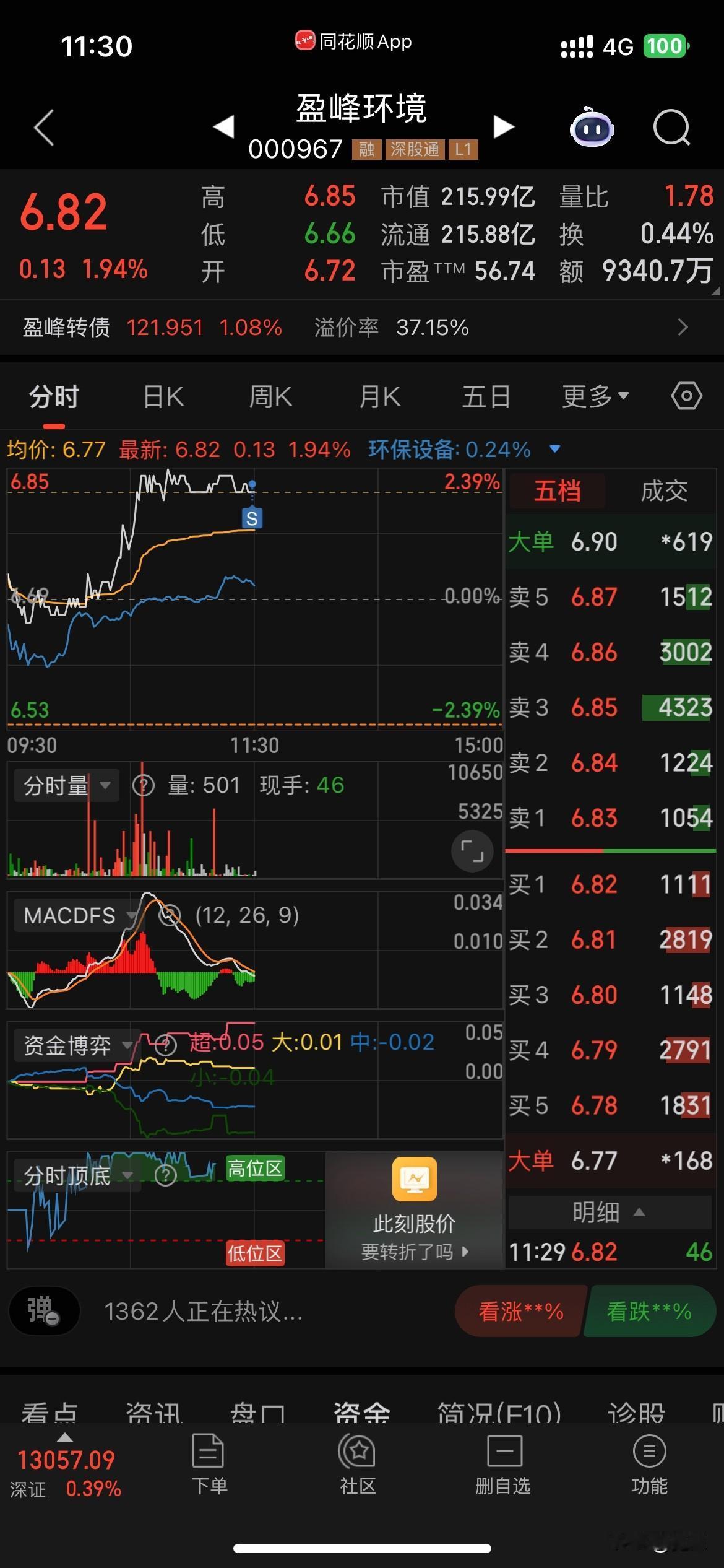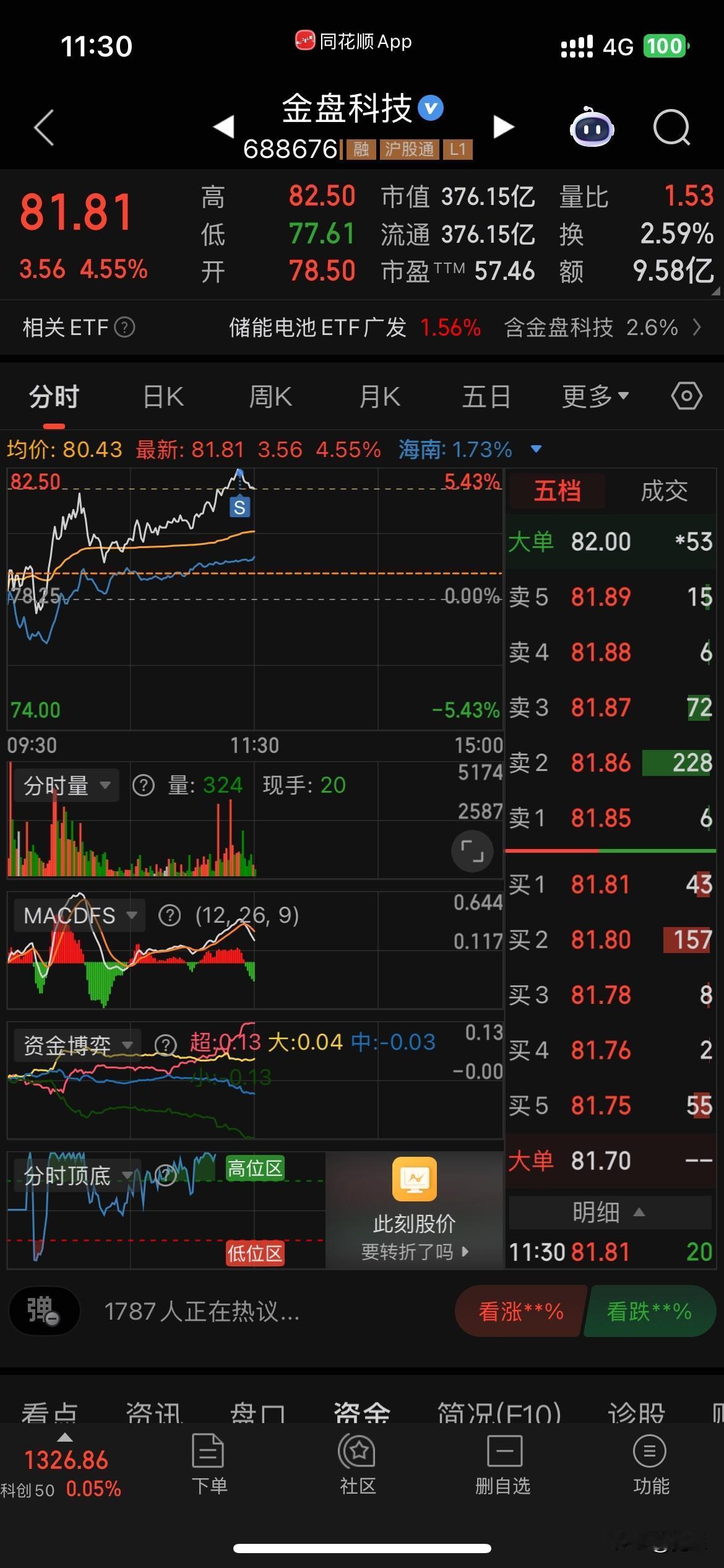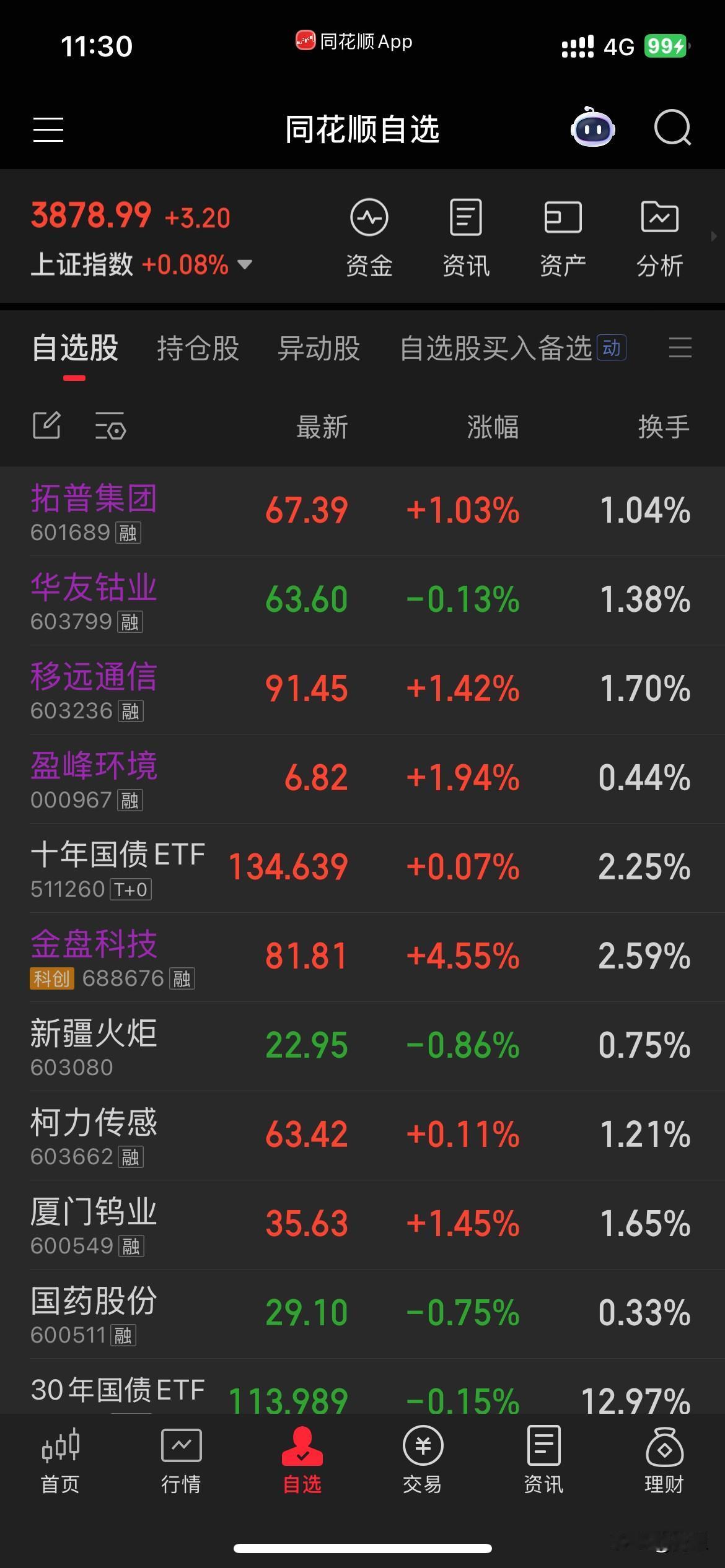 上午收盘了,大盘在没有放量的情况下节节攀高。我还是有点担心。高点卖光了金盘,出了一半盈峰。上午还少量各买了2百股拓普和华友。如果下午下跌,尾盘再各加200股。还有看看金盘能不能捡回来。上午盈利1千6左右,侧重稳扎稳打,不贪。目前大盘感觉有点稳住了,很多股都出现了止跌回升迹象。我还是侧重绩优科技股为主。
