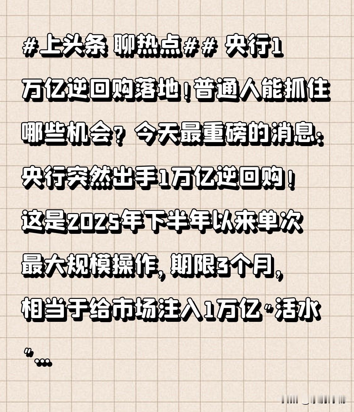 央行1万亿逆回购落地!普通人能抓住哪些机会? 今天最重磅的消息:央行突然出手1万亿逆回购!这是2025年下半年以来单次最大规模操作,期限3个月,相当于给市场注入1万亿"活水"。 很多人看不懂:这1万亿跟我们有啥关系? 简单说,年底银行本来"钱袋子"紧张,企业贷款难、个人房贷利率可能上涨。但有了这笔钱: ✅ 小微企业经营贷审批已从7天缩到5天,利率稳定在3.85% ✅ 房贷利率不会"年底突击涨价",刚需买房可抓紧窗口 ✅ 股市债市波动减小,今天A股三大指数已应声上涨 但要注意:这不是"大水漫灌"!央行明确资金不会流向房地产炒作,而是精准滴灌实体经济。 其实这背后藏着三个信号: 1️⃣ 稳经济:避免年底资金链断裂,给企业"续命" 2️⃣ 促民生:保障普通人贷款成本稳定 3️⃣ 防风险:提前应对可能的流动性危机 你觉得这1万亿逆回购对你的生活有影响吗?是该趁机贷款创业,还是持币观望?