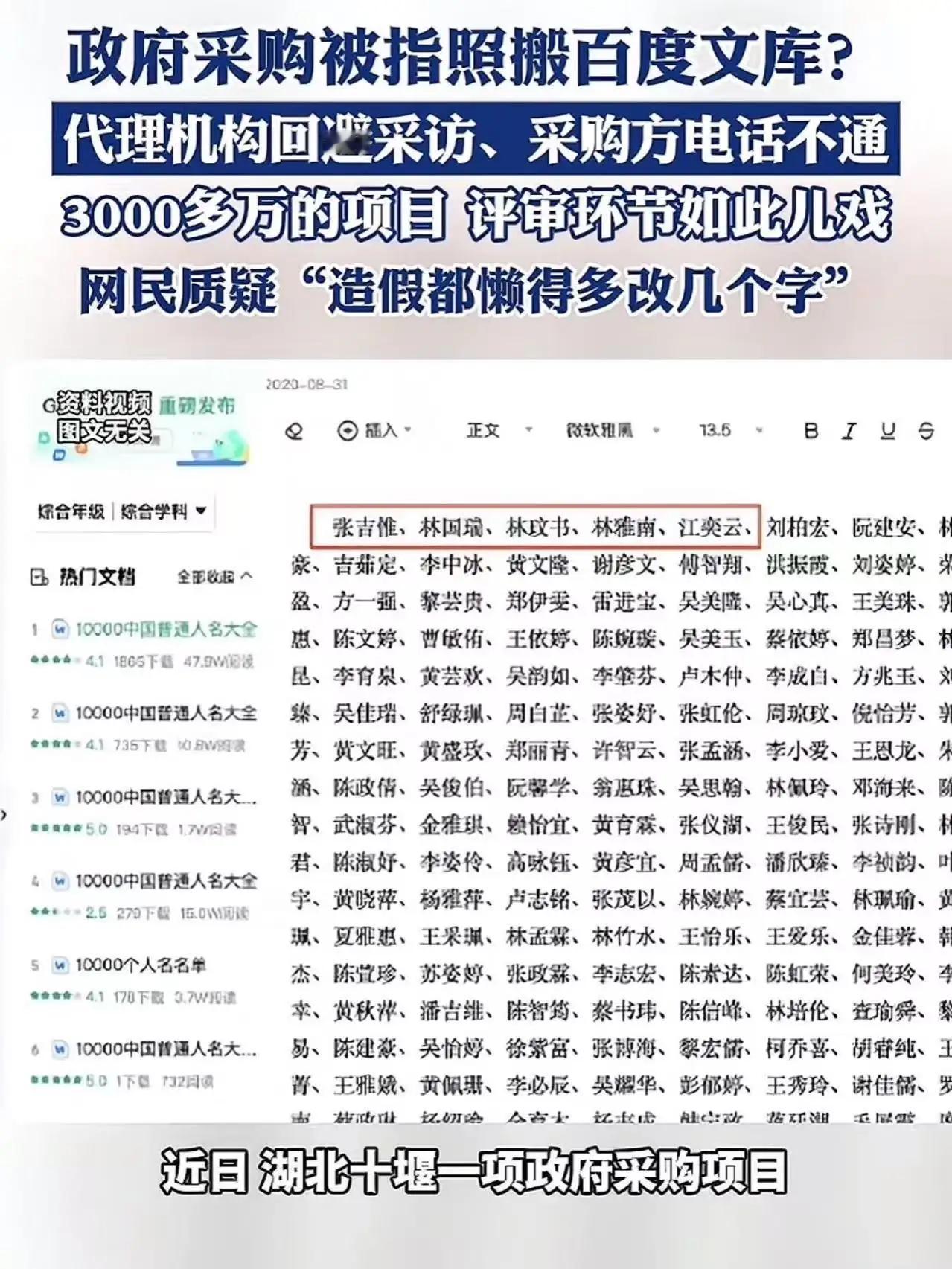 荒唐至极!3000多万的政府采购项目,竟然连造假都偷懒了!湖北十堰,一项政府采购项目被爆出评审小组名单,完全照搬百度文库1万中国普通人名大全前五名!连顺序都没有改,直接复制粘贴进了中标公告。网友直呼:这也太敷衍了吧,连演都懒得演了? 试想一下,一个政府项目,花费如此巨资,本应体现出严谨与公正,却竟然如此随意、如此草率。这不仅仅是个“抄袭”问题,更折射出的是我们制度背后那令人担忧的“懒散”与“敷衍”。在这个信息爆炸、透明度日益提高的时代,竟然还有如此“原生态”的操作,难免让人怀疑:我们究竟还在用什么样的态度对待公共资金?是不是有人在暗中偷懒、在游戏规则之外打擦边球? 更令人心疼的是,这样的“懒惰”背后,隐藏着多少潜在的风险?评审名单的随意复制,是否意味着整个项目的公平公正都被打了折扣?如果连最基本的“人名”都可以如此“随意”,那么,其他环节的严谨性又在哪里?这不仅仅是个“笑话”,更是对公众信任的严重伤害。公众的钱财,难道就可以如此随意、如此草率地“处理”? 而更深层次的问题在于:这背后折射出的制度漏洞和监管缺失,难道我们就这样任由其发展?如果连最基本的“诚信”都无法保证,那么我们还谈什么“法治”与“公平”?这不仅仅是十堰一地的问题,而是一个全国性、甚至是全球性的问题。我们需要的,是制度的自我净化,是对每一个环节的严格把控,是对公众权益的真正尊重。 或许有人会说:“这只是个个别现象,不足为虑。”但我想问:如此“个别”的背后,隐藏着多少“普遍”的隐患?我们是否还记得,正是这些“看似微不足道”的疏漏,逐渐侵蚀着制度的根基?当某些人习惯了“走过场”,当“敷衍”成为一种潜规则,我们还能期待一个公平、透明的未来吗? 这起事件,或许只是冰山一角,但它提醒我们:制度的生命力在于执行力,在于每一个细节的严谨。在这个充满变革与挑战的时代,我们更需要的是一种责任感、一份敬畏心。只有这样,公共资金才能真正用在刀刃上,公众的信任才能真正得以修复。 所以,面对这样的“荒唐”,我们不应只是笑笑了事,而是要发出声音,要求问责,推动制度的完善。因为,只有当我们敢于直面问题、勇于揭露黑暗,未来的道路才会更加光明。别让这些“懒散”成为我们前进的绊脚石,让我们共同期待一个更加透明、公正的社会!荒唐至极!3000多万的政府采购项目,竟然连造假都偷懒了!湖北十堰,一项政府采购项目被爆出评审小组名单,完全照搬百度文库1万中国普通人名大全前五名!连顺序都没有改,直接复制粘贴进了中标公告。网友直呼:这也太敷衍了吧,连演都懒得演了? 试想一下,一个政府项目,花费如此巨资,本应体现出严谨与公正,却竟然如此随意、如此草率。这不仅仅是个“抄袭”问题,更折射出的是我们制度背后那令人担忧的“懒散”与“敷衍”。在这个信息爆炸、透明度日益提高的时代,竟然还有如此“原生态”的操作,难免让人怀疑:我们究竟还在用什么样的态度对待公共资金?是不是有人在暗中偷懒、在游戏规则之外打擦边球? 更令人心疼的是,这样的“懒惰”背后,隐藏着多少潜在的风险?评审名单的随意复制,是否意味着整个项目的公平公正都被打了折扣?如果连最基本的“人名”都可以如此“随意”,那么,其他环节的严谨性又在哪里?这不仅仅是个“笑话”,更是对公众信任的严重伤害。公众的钱财,难道就可以如此随意、如此草率地“处理”? 而更深层次的问题在于:这背后折射出的制度漏洞和监管缺失,难道我们就这样任由其发展?如果连最基本的“诚信”都无法保证,那么我们还谈什么“法治”与“公平”?这不仅仅是十堰一地的问题,而是一个全国性、甚至是全球性的问题。我们需要的,是制度的自我净化,是对每一个环节的严格把控,是对公众权益的真正尊重。 或许有人会说:“这只是个个别现象,不足为虑。”但我想问:如此“个别”的背后,隐藏着多少“普遍”的隐患?我们是否还记得,正是这些“看似微不足道”的疏漏,逐渐侵蚀着制度的根基?当某些人习惯了“走过场”,当“敷衍”成为一种潜规则,我们还能期待一个公平、透明的未来吗? 这起事件,或许只是冰山一角,但它提醒我们:制度的生命力在于执行力,在于每一个细节的严谨。在这个充满变革与挑战的时代,我们更需要的是一种责任感、一份敬畏心。只有这样,公共资金才能真正用在刀刃上,公众的信任才能真正得以修复。 所以,面对这样的“荒唐”,我们不应只是笑笑了事,而是要发出声音,要求问责,推动制度的完善。因为,只有当我们敢于直面问题、勇于揭露黑暗,未来的道路才会更加光明。别让这些“懒散”成为我们前进的绊脚石,让我们共同期待一个更加透明、公正的社会!招标评审 招标透明化