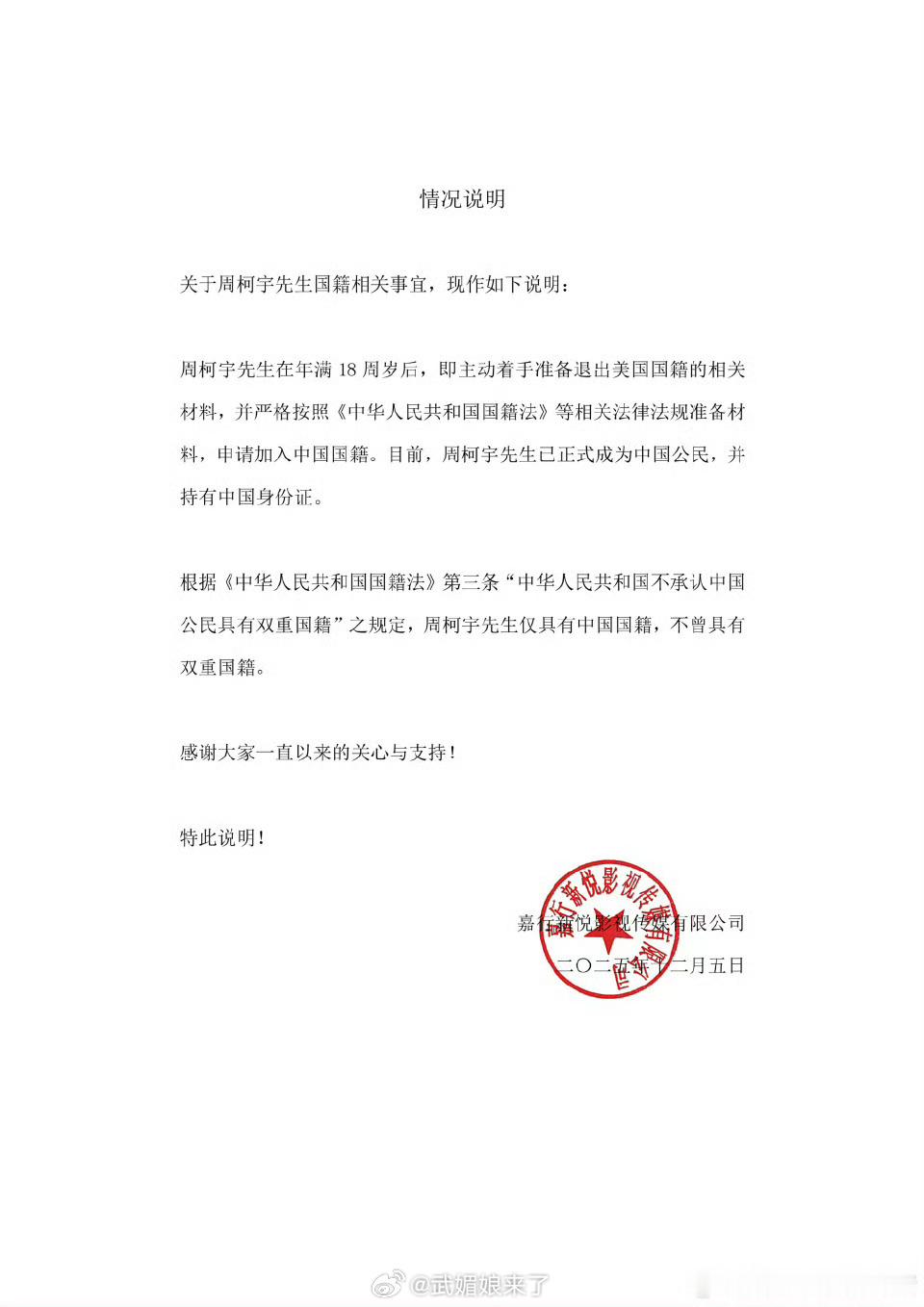 周柯宇工作室声明:周柯宇已加入中国国籍,成为中国公民。