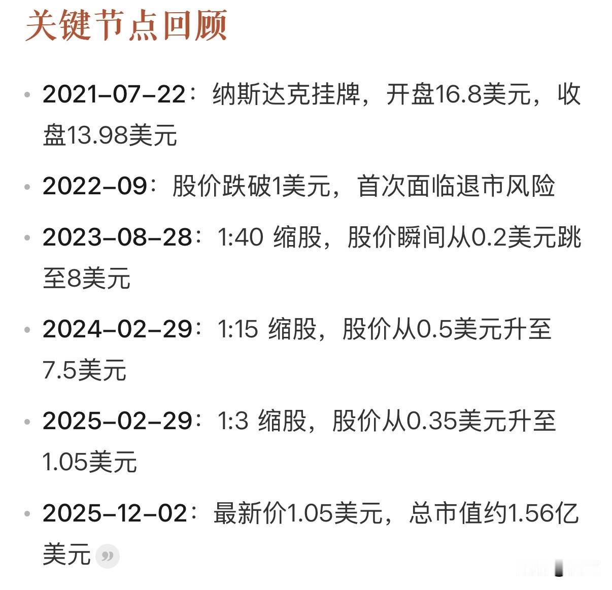 贾跃亭我不知道,但FFAI很差劲。 大A绝对没有过, 如果你在2021年7月22日FFAI上市当天投入10,000美元,按当时收盘价约13.98美元/股计算,可买约716股;今天(2025-12-02)股价1.05美元,你的持仓价值仅剩约752美元 ,累计亏损92.5%。 来看看这个过程,大A从来没有过。 FFAI 在 2023-2025 年间连续三次反向拆股(1:40→1:15→1:3),贾跃亭及高管团队通过多轮回购、债转股与股权激励,试图稳住股价与上市地位,但市值仍从 60 亿美元缩水至不足 2 亿美元。 债转股与股权稀释 以恒大 6 亿美元投资为例, 2019 年贾跃亭个人破产重组,36 亿美元债务转为 FF 股权,债权人获 17.2% 股份;恒大 6 亿美元投资同样债转股,锁定期长且随多次缩股被稀释,当前价值趋近于零。 2023-08-28:首次 1:40 反向拆股,股价从 0.2 美元抬升至约 8 美元 2024-02-29:第二次 1:15 反向拆股,继续避免退市红线 2025-02-29:第三次 1:3 反向拆股,维持纳斯达克 1 美元最低要求。