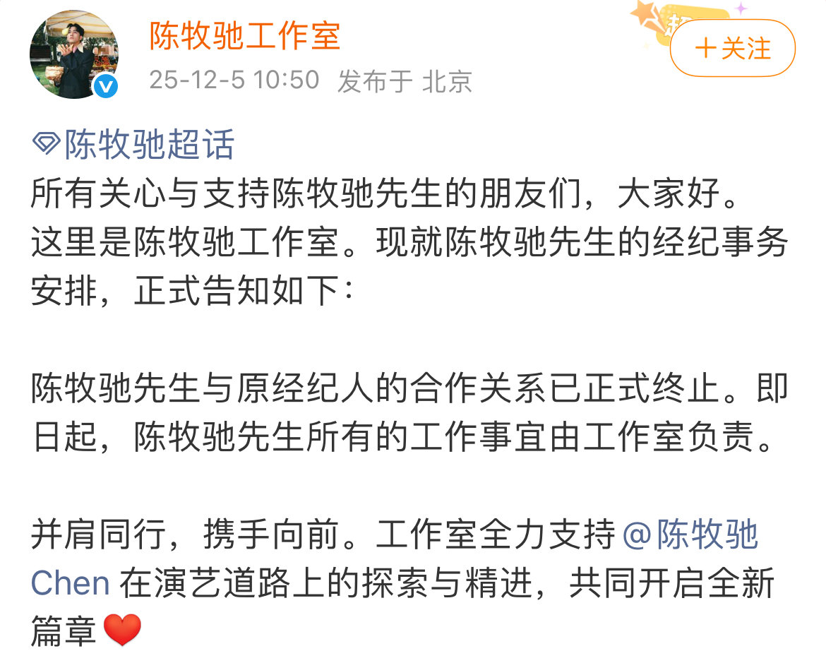 陈牧驰与经纪人合作终止 陈牧驰和经纪人不继续合作陈牧驰与经纪人合作终止!陈牧驰和经纪人不继续合作! 陈牧驰发文:“冬天,大概是个适合分别的季节。我和我经纪人伙伴,因业务调整,不再继续合作。后续工作统一由负责和推进。”